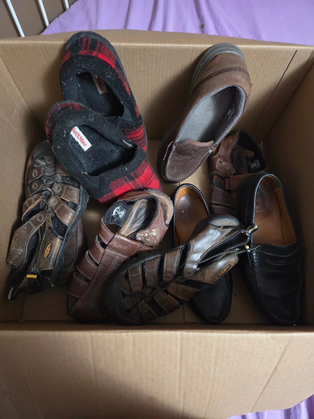Selling a mixed lot of shoes! There are a few pairs in here, including SoftMoc slippers and Keen sandals. Good for someone looking for a variety of footwear options!