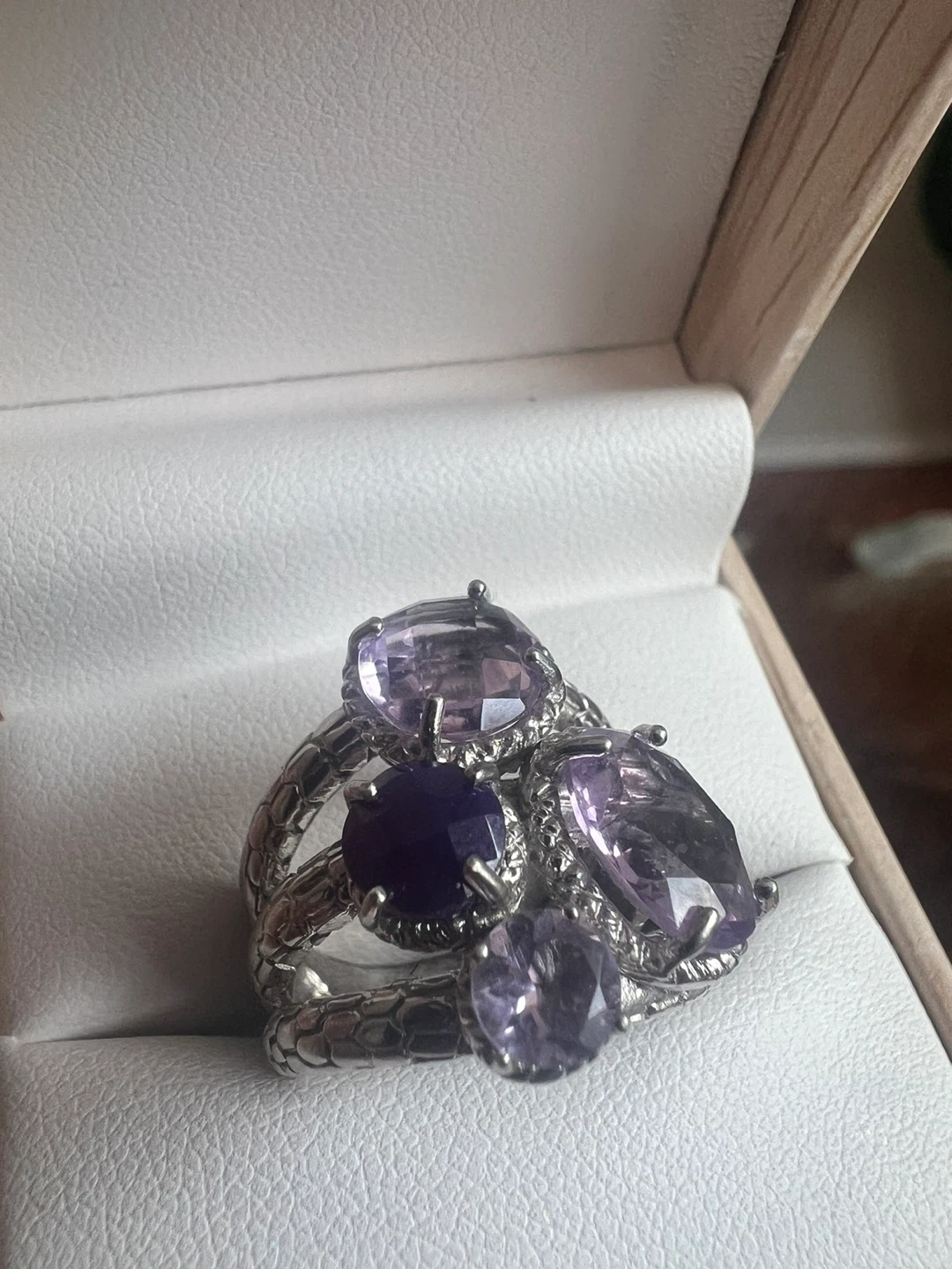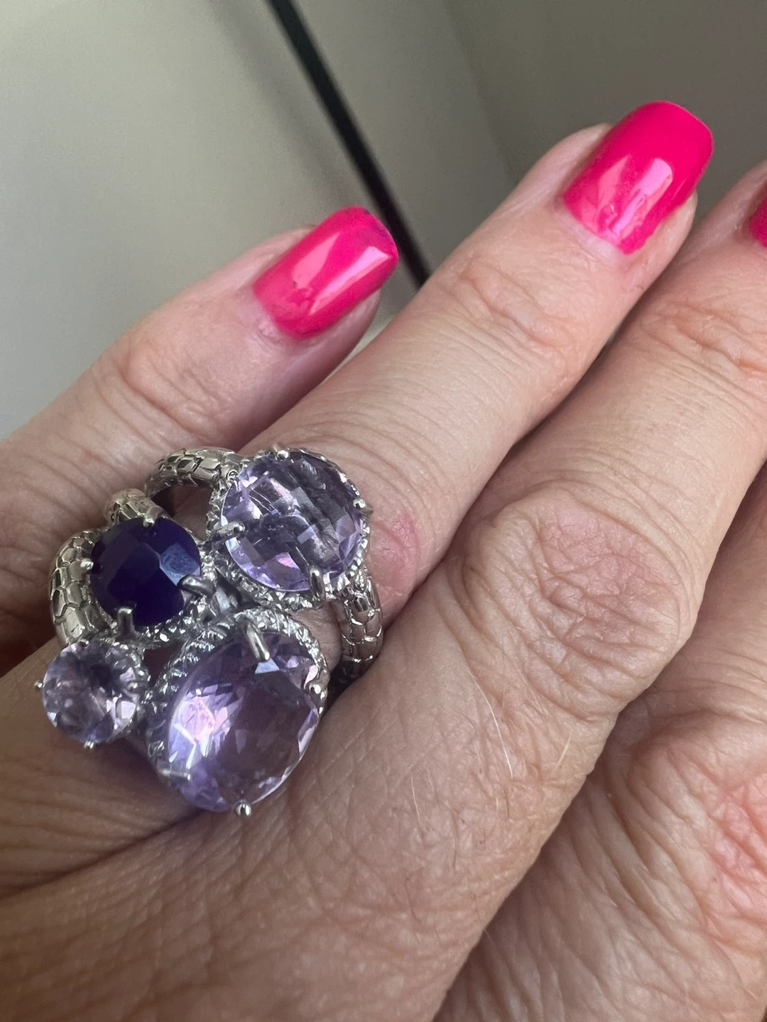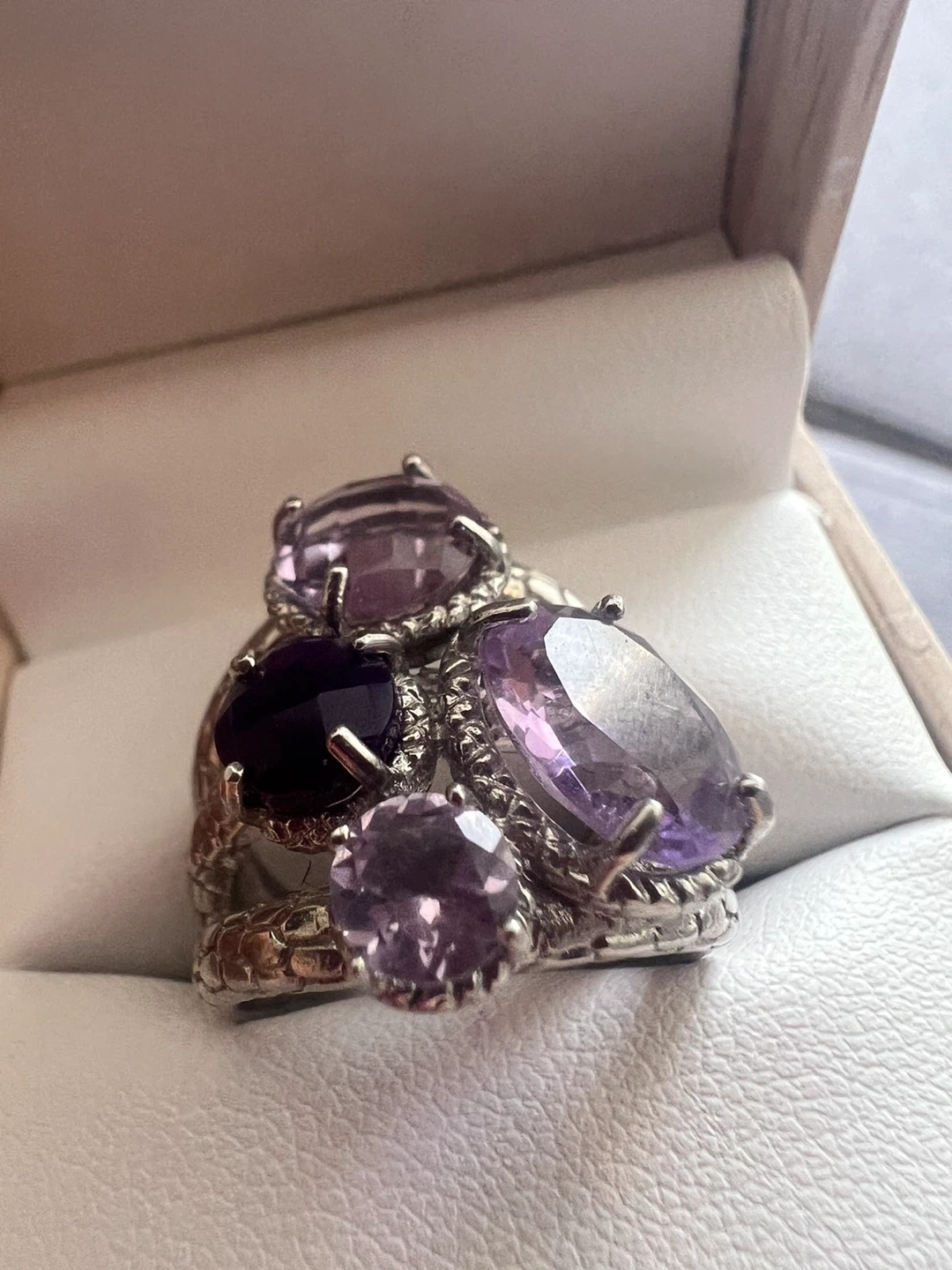 This is a beautiful sterling silver ring with multiple amethyst stones. The ring is marked "925", indicating its sterling silver composition. It's in great condition and ready to add a touch of elegance to any outfit!