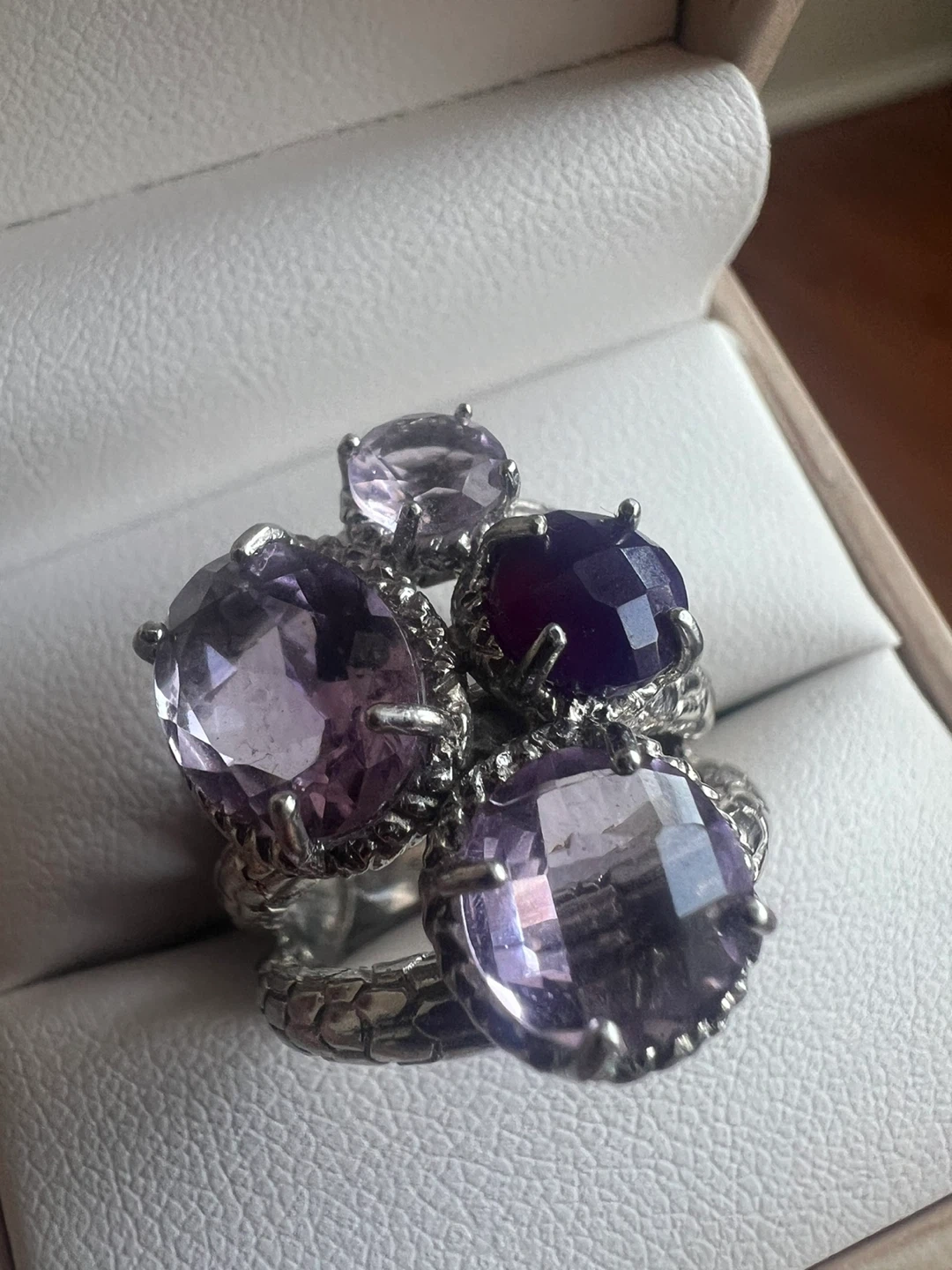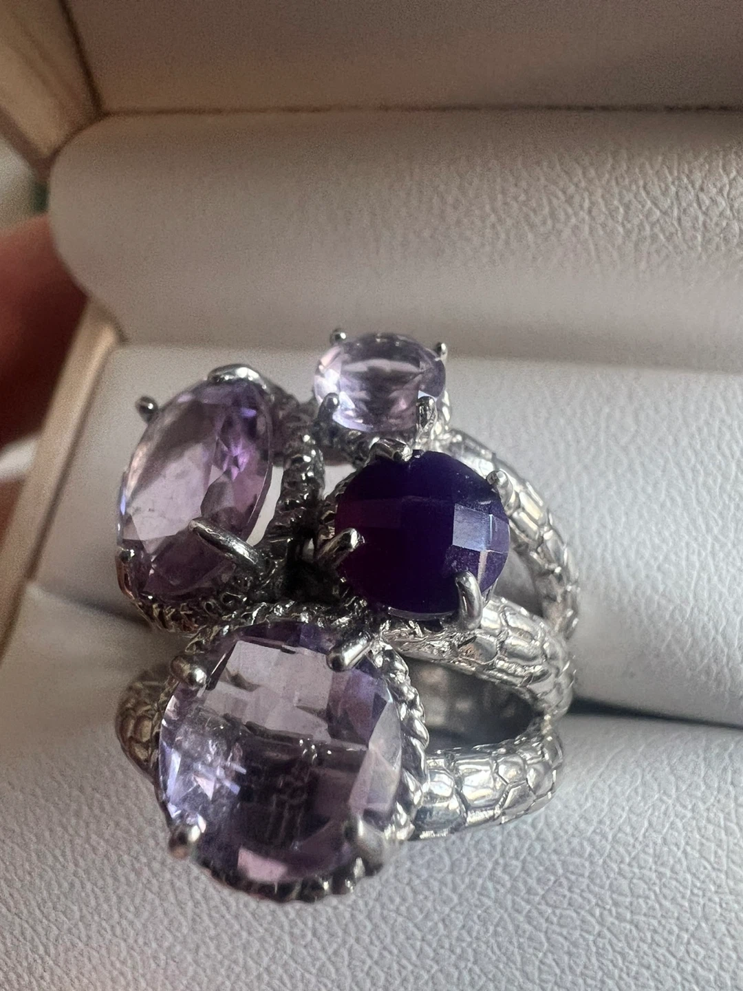 This is a beautiful sterling silver ring with multiple amethyst stones. The ring is marked "925", indicating its sterling silver composition. It's in great condition and ready to add a touch of elegance to any outfit!