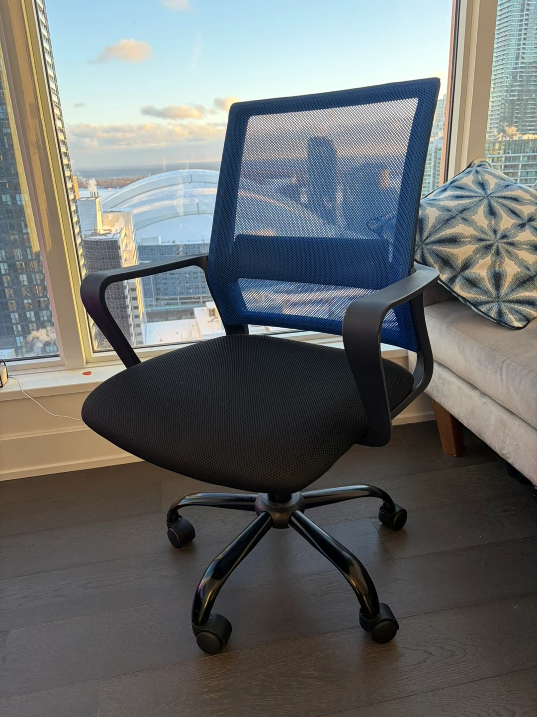 This mesh office chair features a breathable blue back and a comfortable black seat. It has a sturdy black base with rolling casters for easy mobility. The adjustable height makes it adaptable for different desk setups. This chair is good for office work or home study.