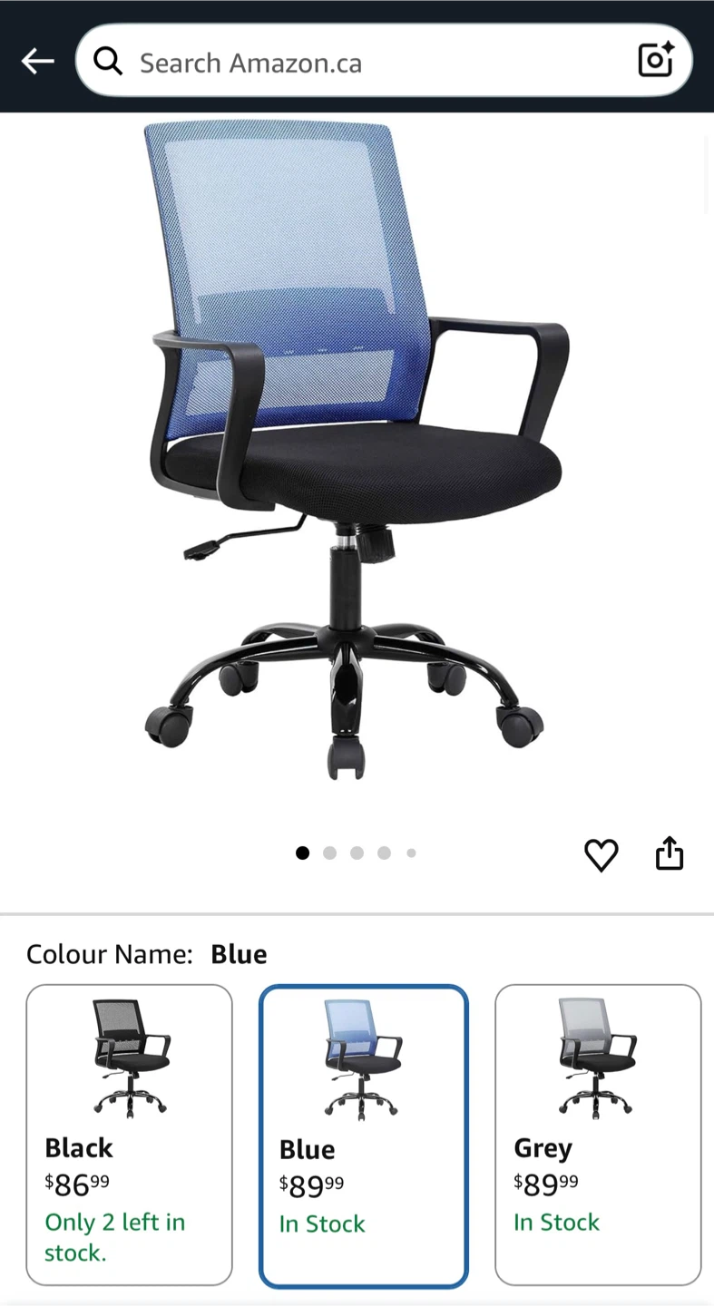 This mesh office chair features a breathable blue back and a comfortable black seat. It has a sturdy black base with rolling casters for easy mobility. The adjustable height makes it adaptable for different desk setups. This chair is good for office work or home study.