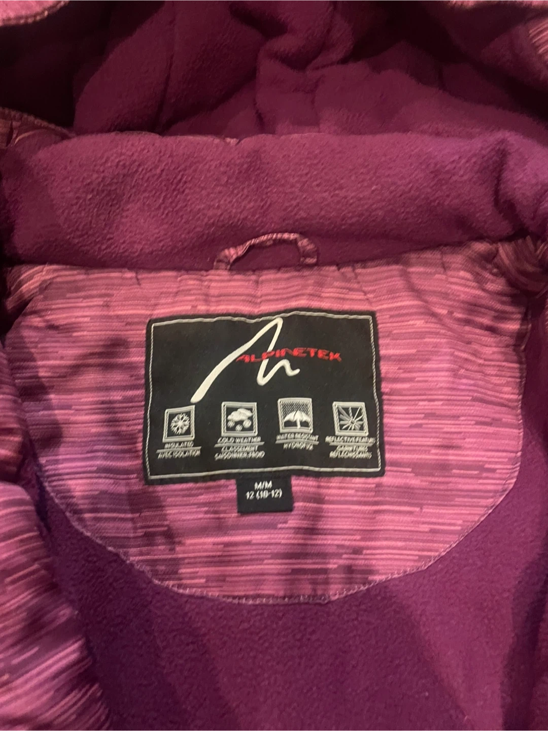 Here's a purple Alpine Tek winter jacket, perfect for keeping warm! It's a size M (10-12). Great for cold weather activities and has a water-resistant exterior.