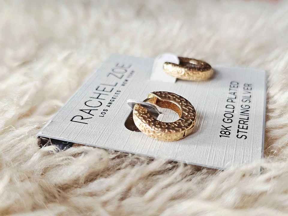 Brand new chic Rachel Zoe small huggie hoop earrings, embossed in a textured pattern that resembles leopard print. Made of 925 sterling silver and plated in 18K gold. They are hollow on the inside so they are lightweight and comfortable. Perfect minimal but unique earrings for everyday wear or gifting.