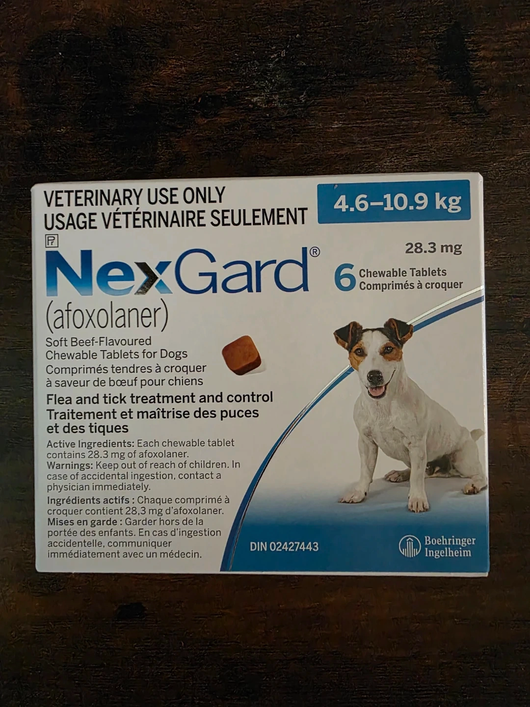 Selling a box of NexGard chewable tablets for dogs, suitable for dogs weighing between 4.6-10.9 kg. These soft beef-flavoured tablets provide flea and tick treatment and control. The expiration date is June 2026