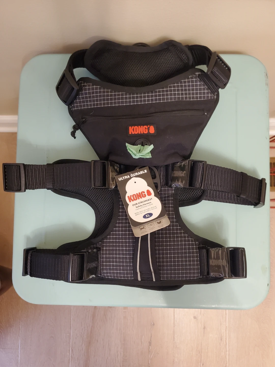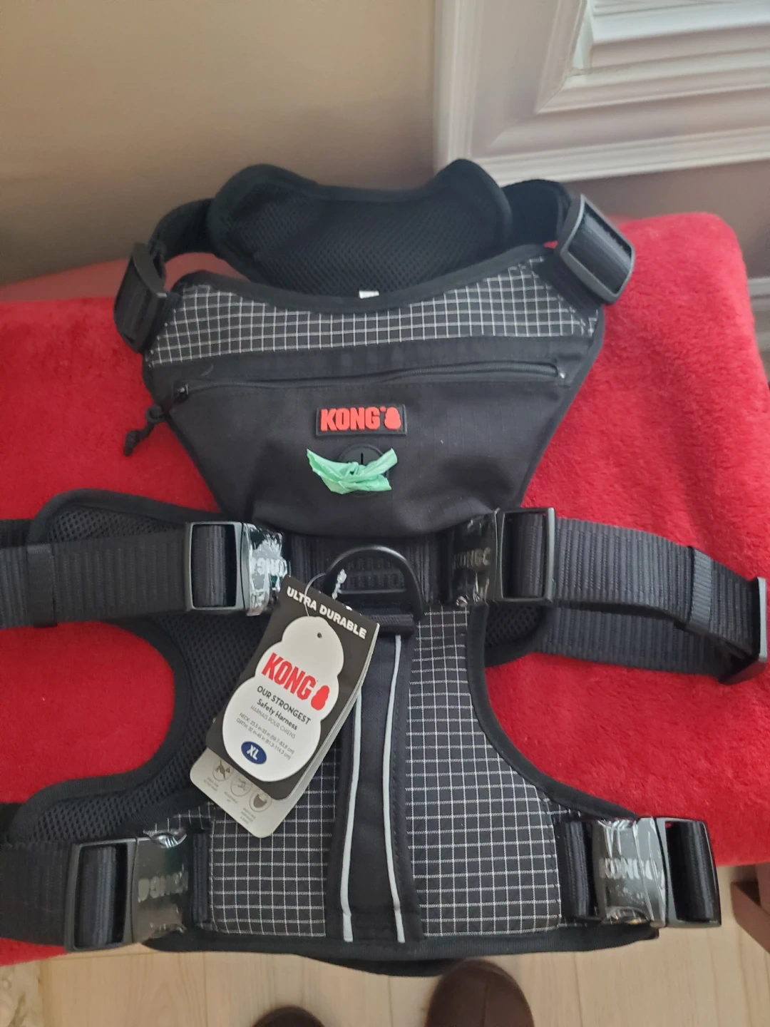 BNWT. This is a KONG Our Strongest Safety Harness for dogs, size XL. It fits neck sizes 23.5-33 inches (59.7-83.8 cm) and girth sizes 32-45 inches (81.3-114.3 cm). Great for active dogs and adjustable fit, plus it has a waste bag dispenser and bags. Pick up only near St Clair and Victoria Park.