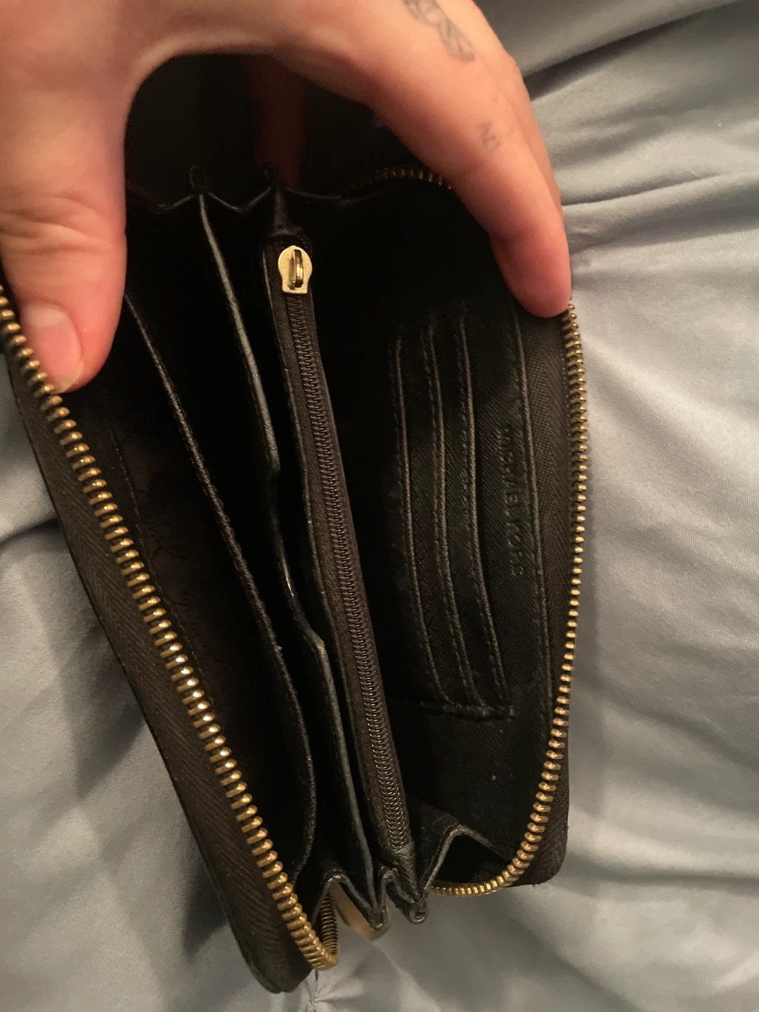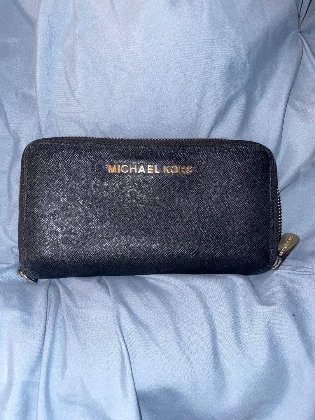 Selling a gently used Michael Kors wallet in black. It has a zippered closure and plenty of space for cards and cash.
