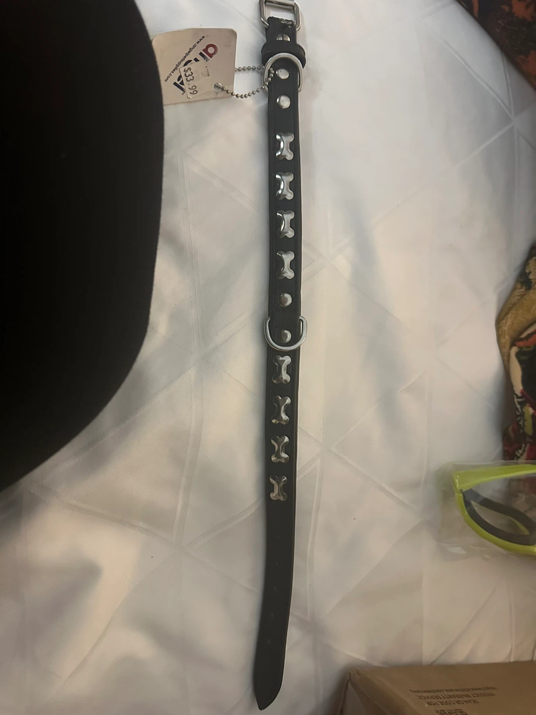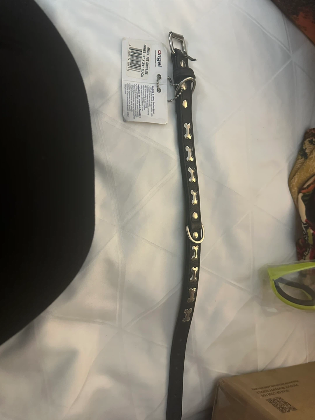 This is a black dog collar from Angel Pet Supplies. It's size 18" by 5/8" and features a bone design. It's in great condition and ready for your furry friend