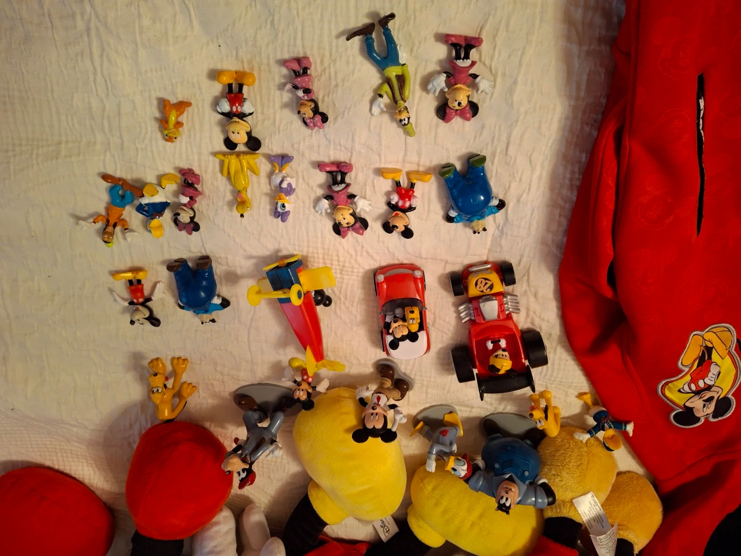 Selling a bundle of Mickey Mouse plush toys, figurines, and a red Mickey Mouse hoodie (size 6)! Great for any Disney fan or collector. The plush toys are in good condition, and the hoodie is a size suitable for a young child. A fun collection to add to any playroom!
