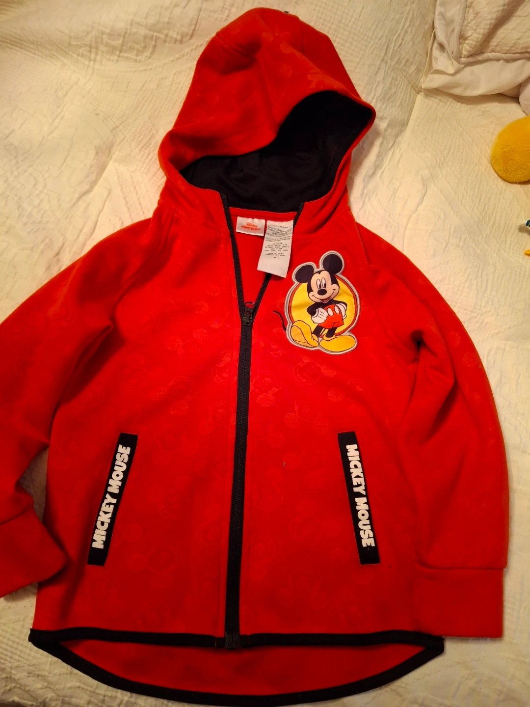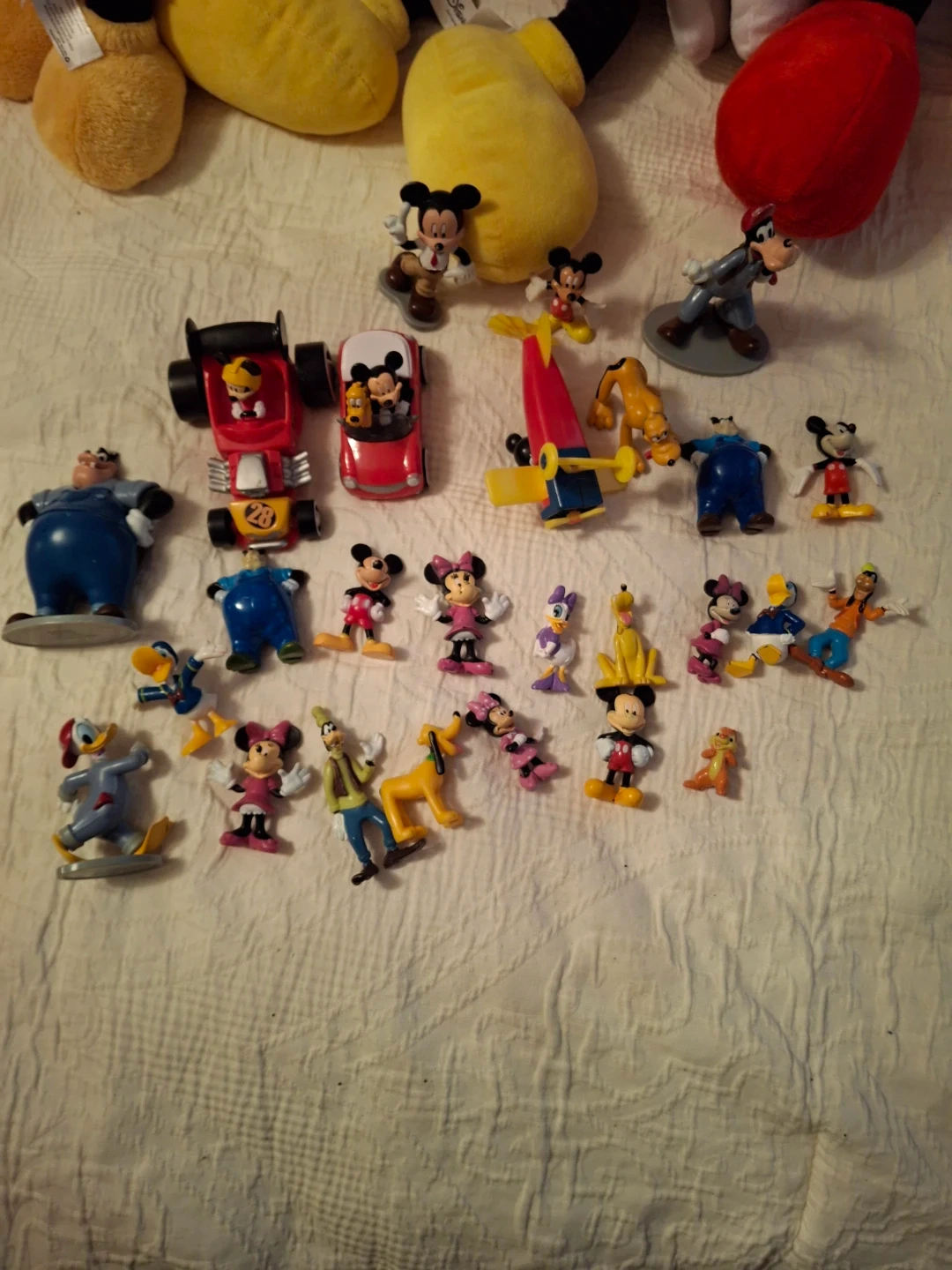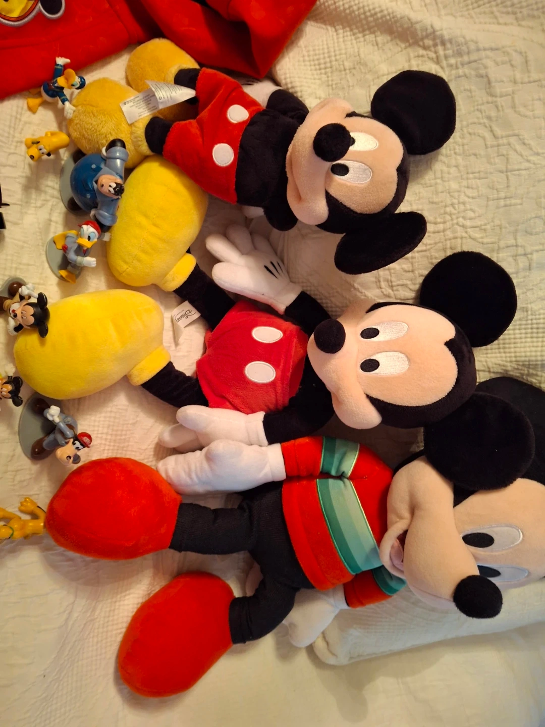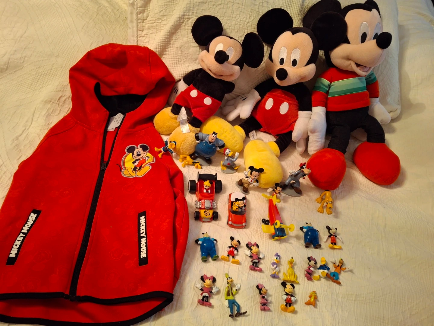 Selling a bundle of Mickey Mouse plush toys, figurines, and a red Mickey Mouse hoodie (size 6)! Great for any Disney fan or collector. The plush toys are in good condition, and the hoodie is a size suitable for a young child. A fun collection to add to any playroom!