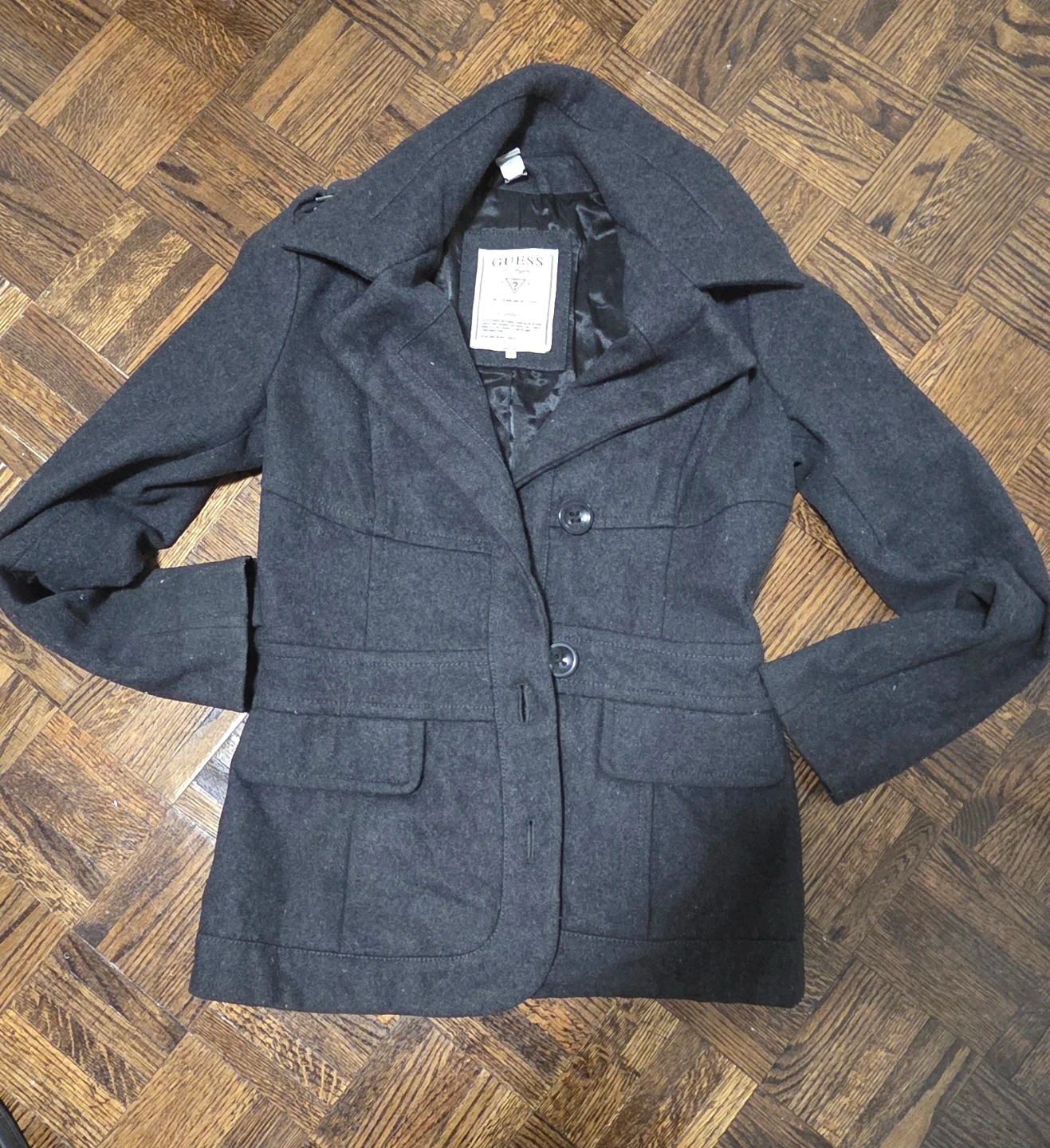 Selling a stylish Guess peacoat in a dark grey colour. It's a size small and made from a wool blend to keep you warm. Perfect for fall or early winter!