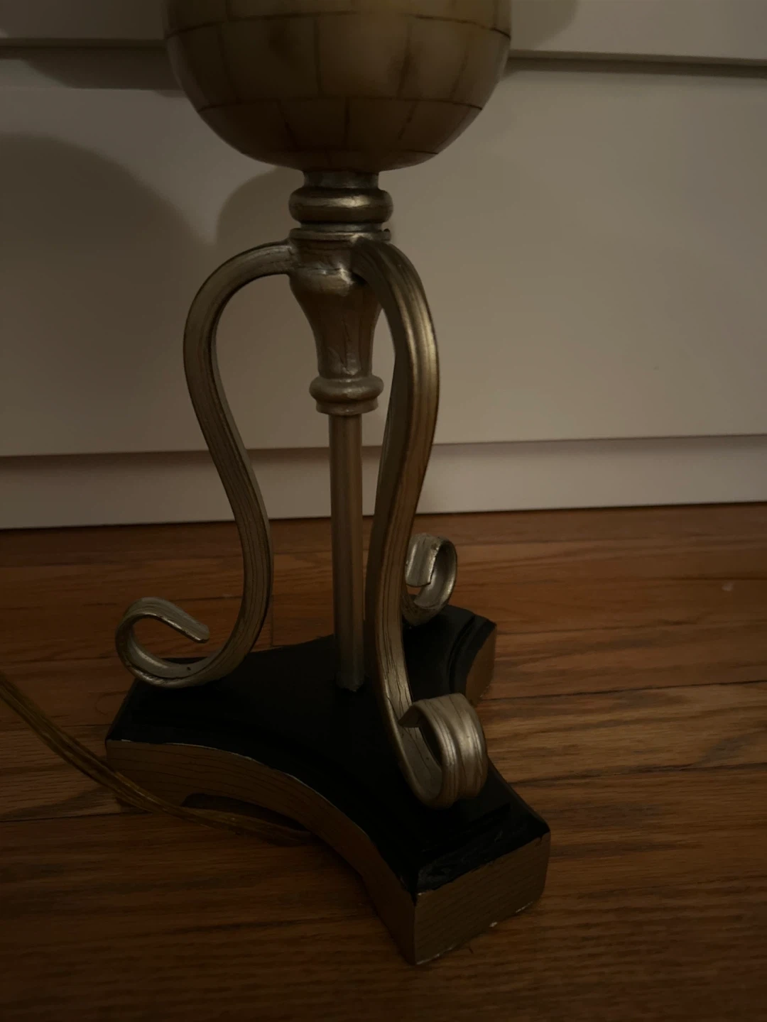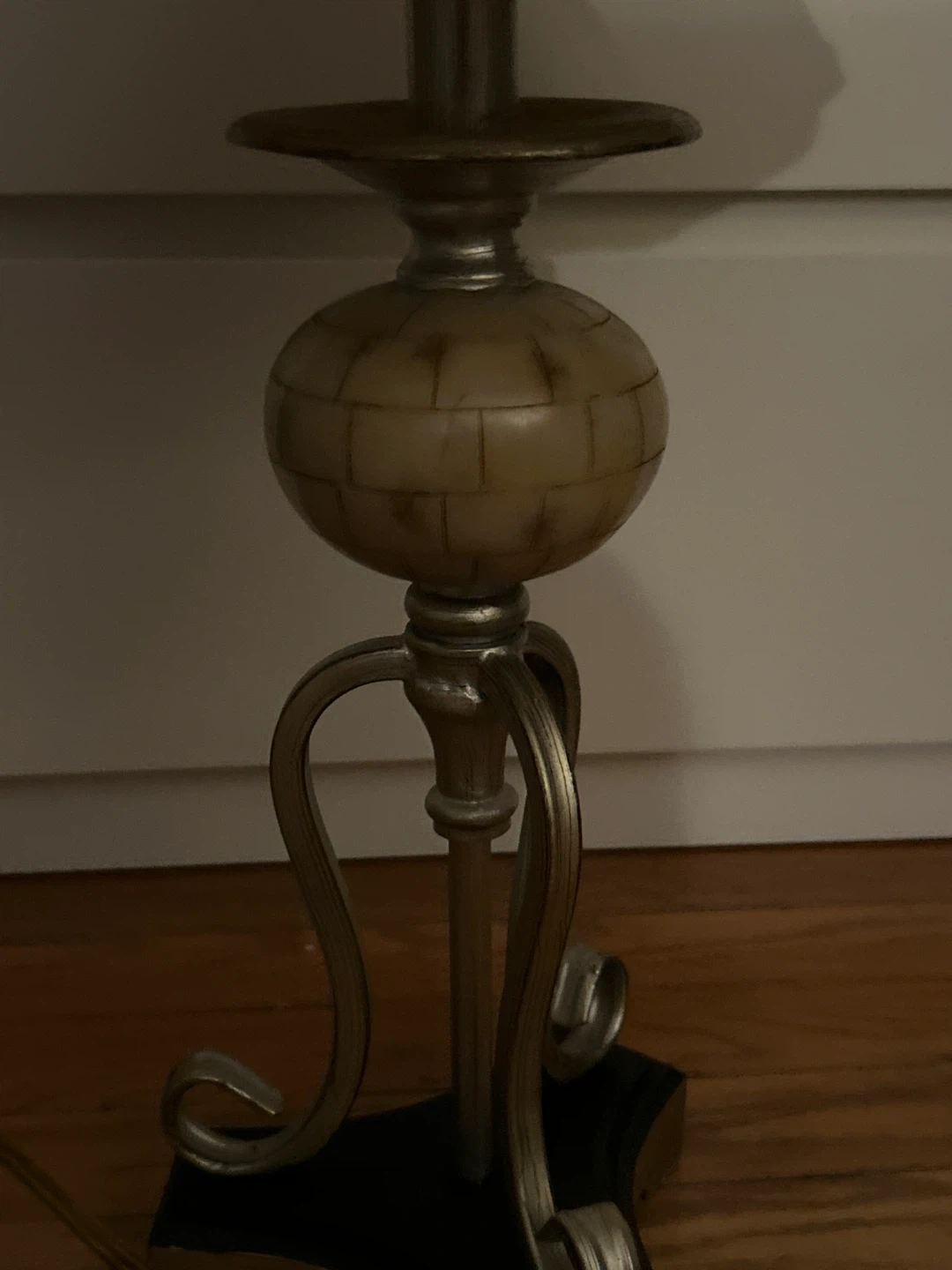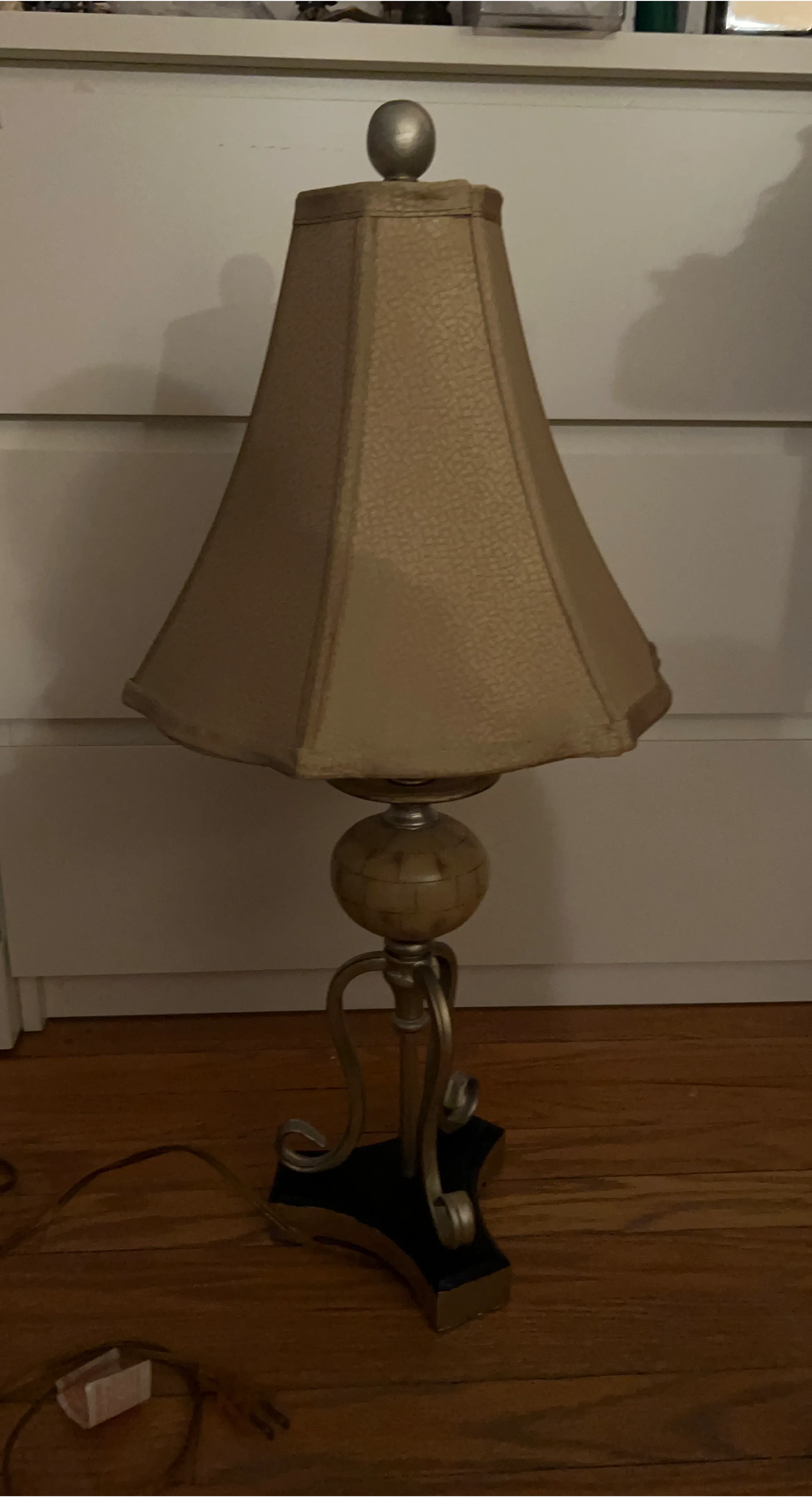 This is an elegant tan table lamp with a unique golden design accents. It has a decorative base and a satin lampshade.