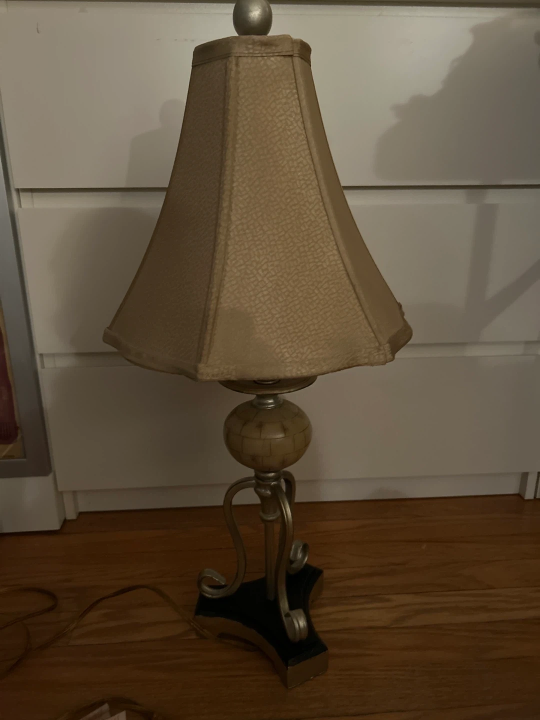 This is an elegant tan table lamp with a unique golden design accents. It has a decorative base and a satin lampshade.