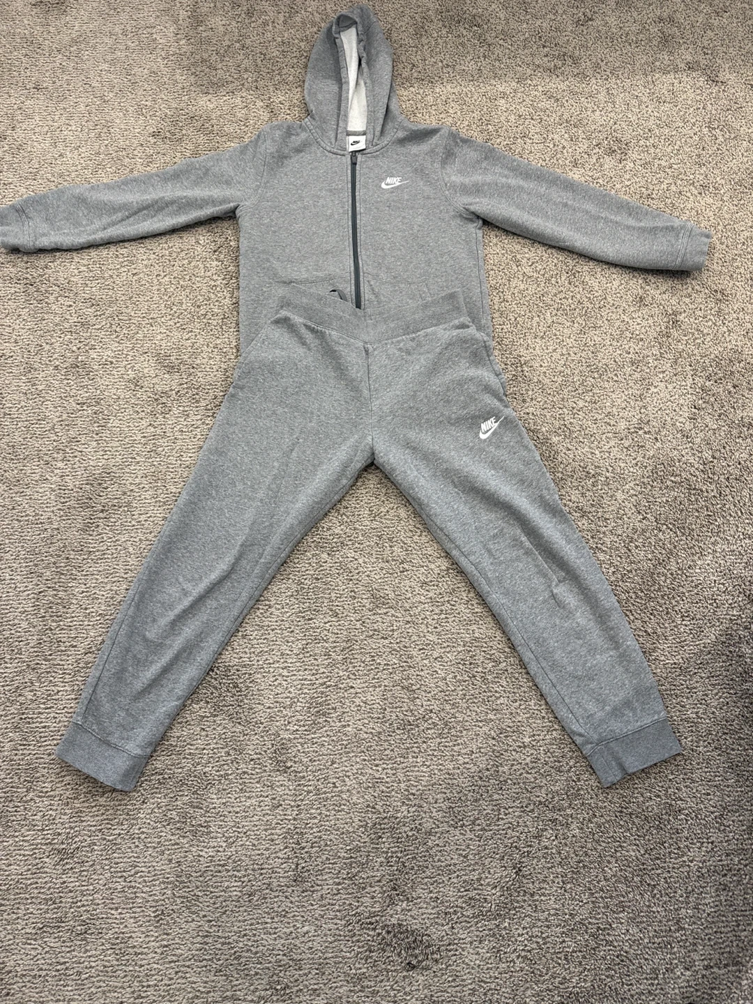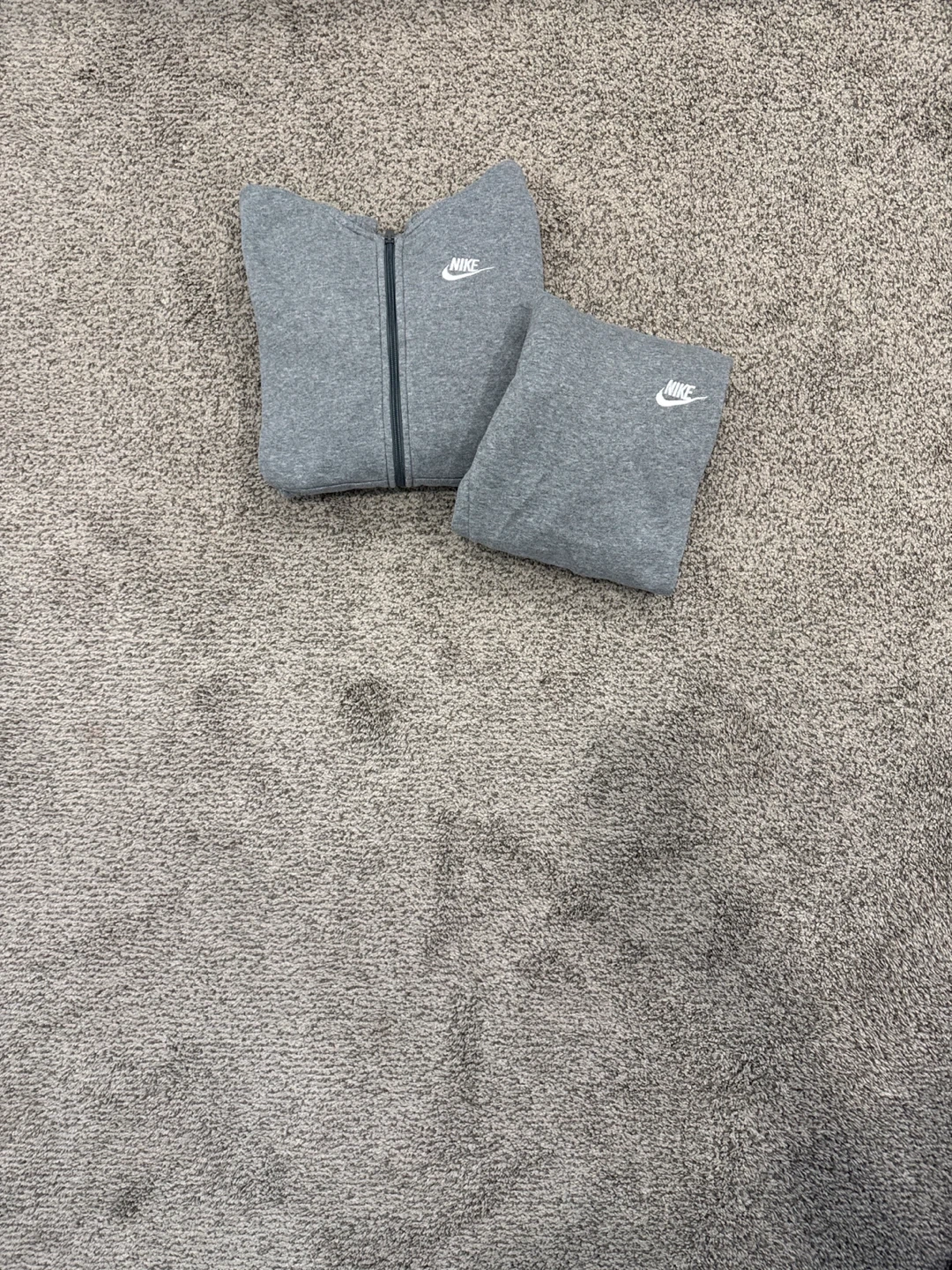 Selling a comfy Nike tracksuit set in grey! Perfect for lounging or working out. The set includes a zip-up hoodie and matching pants, both with the Nike logo. Great for everyday wear!