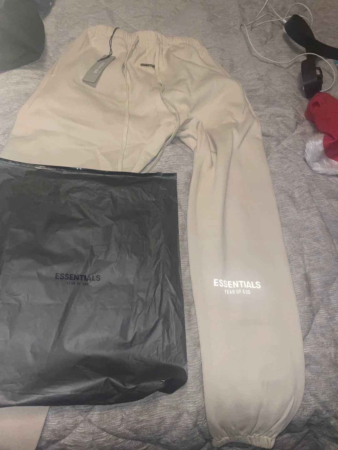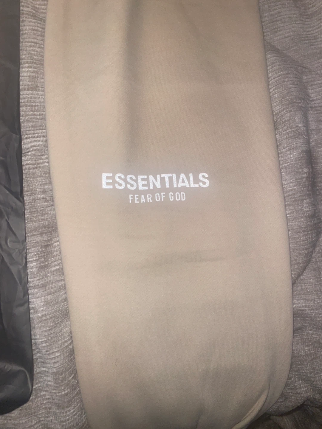 Selling a pair of Essentials Fear of God sweatpants in a beige colour. These are in great condition and come with the original packaging. The logo is printed on the leg. Perfect for lounging or casual wear!