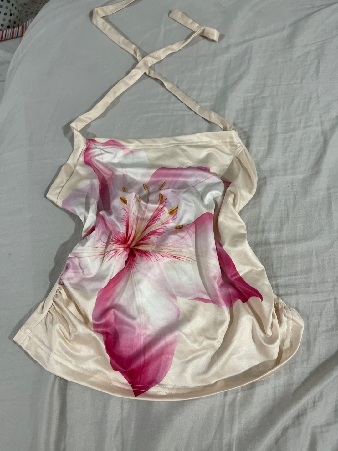 Selling a cute halter top with a lovely floral design! The fabric has a subtle sheen, giving it a silky look. It's in great condition and ready for a new home in your wardrobe. Prefect for summer and jeans for a night out!