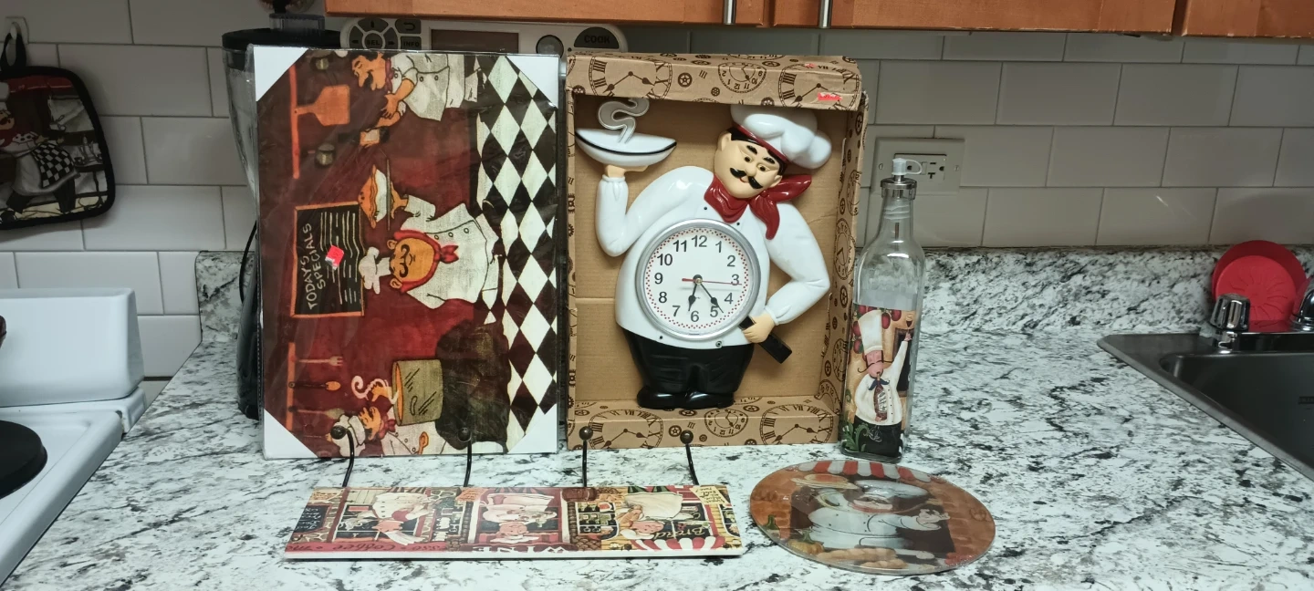 I'm selling a chef-themed kitchen decor set! It includes a chef clock, a decorative bottle, a wall hanging with hooks, a decorative plate, and a framed picture. Perfect for adding a touch of culinary charm to your kitchen