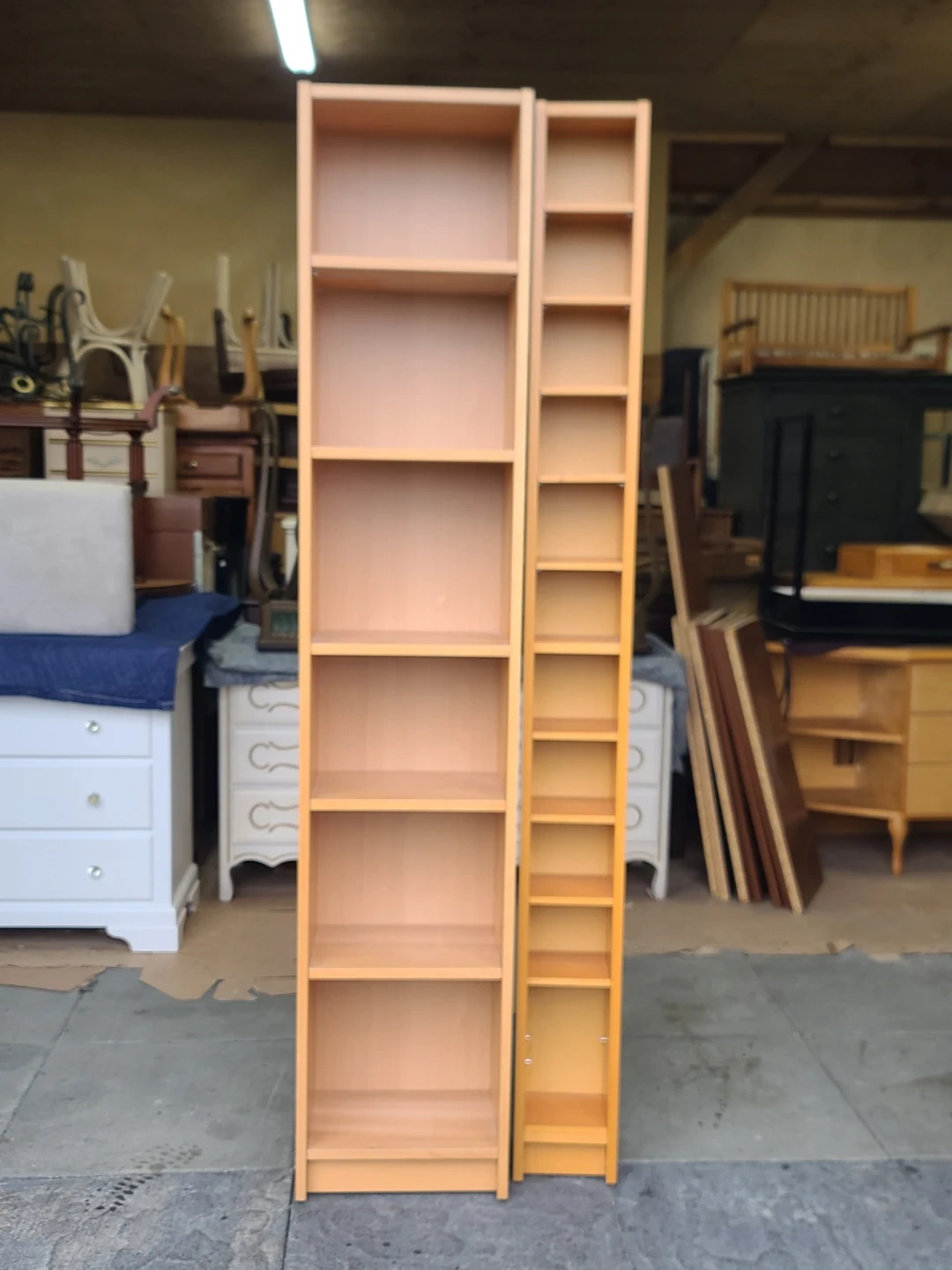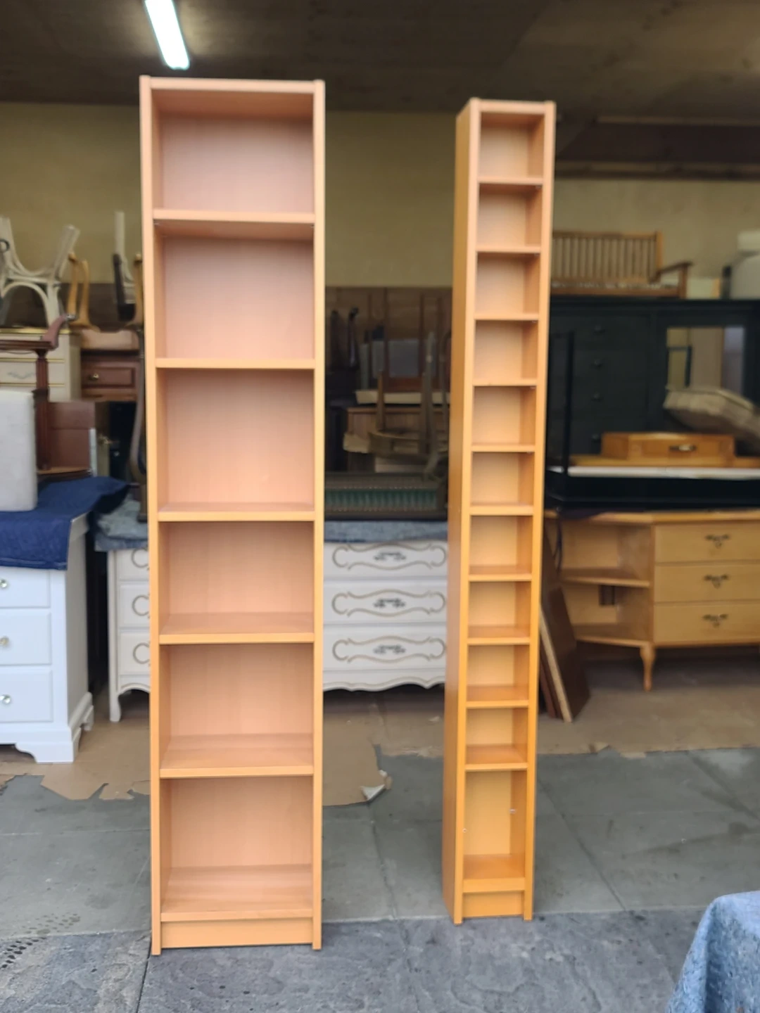 Two beautiful wooden bookcases! One is tall and the other is narrow. They are in good condition and ready for your books or display items. Measurements to follow. Delivery can be arranged. Viewing and pickup by appointment.