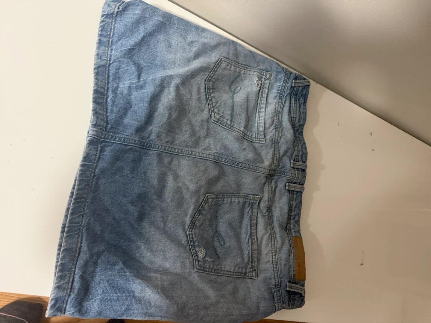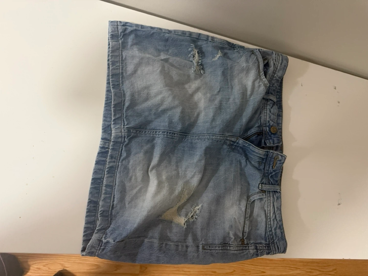 I'm selling an edc denim skirt. It has a light wash and some distressed detailing. It's in good condition and ready for a new owner!
