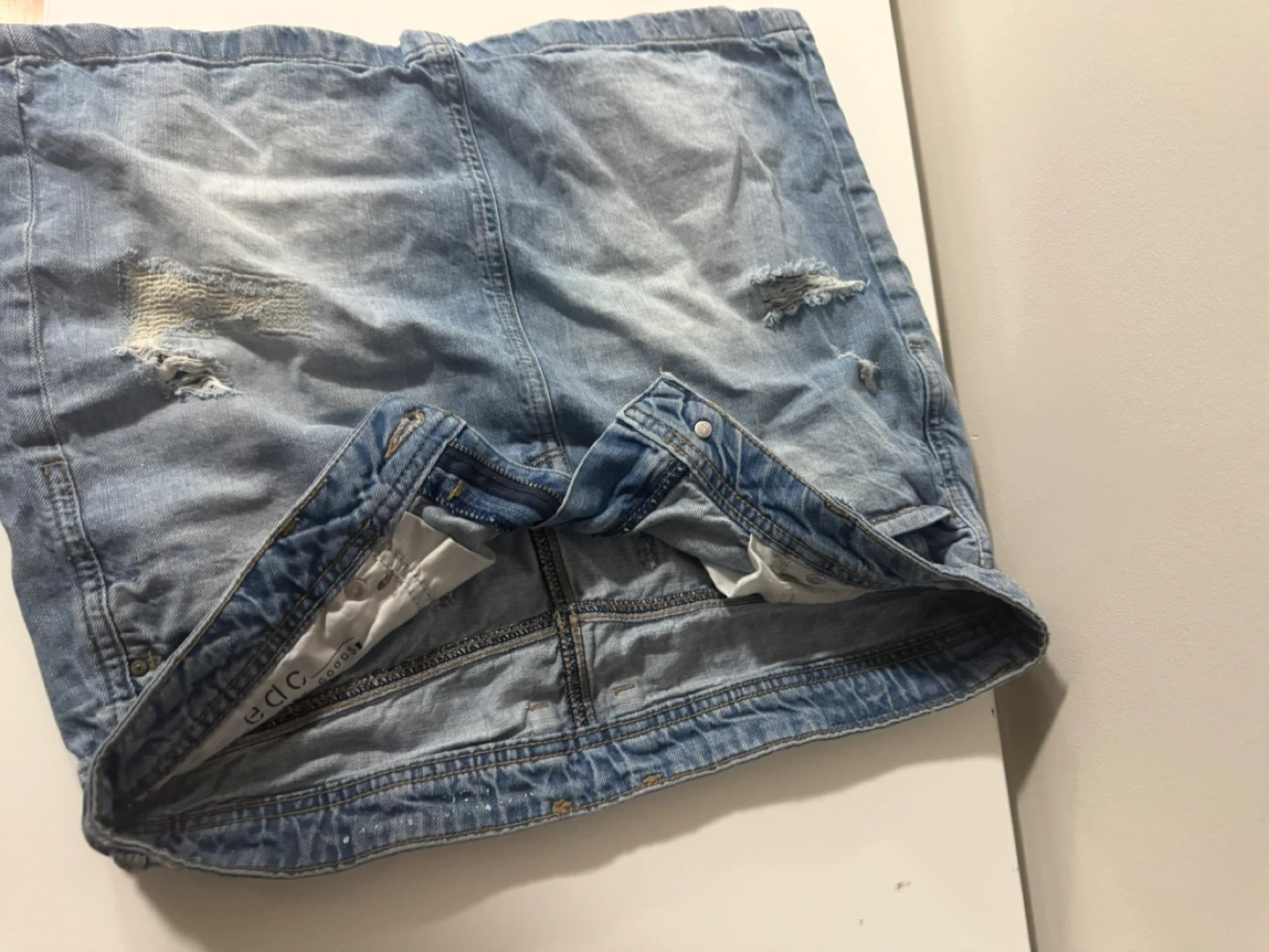 I'm selling an edc denim skirt. It has a light wash and some distressed detailing. It's in good condition and ready for a new owner!