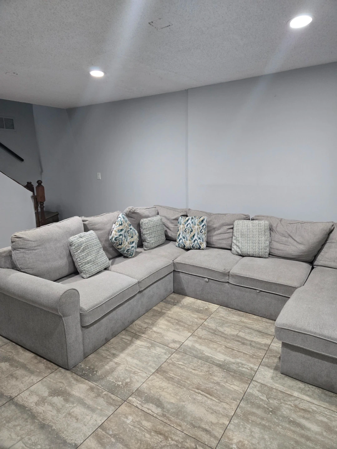 Selling a large sectional sofa in a neutral grey colour. It's a comfortable piece of furniture perfect for a family room or large living space. It comes with a few decorative pillows to complete the look!
