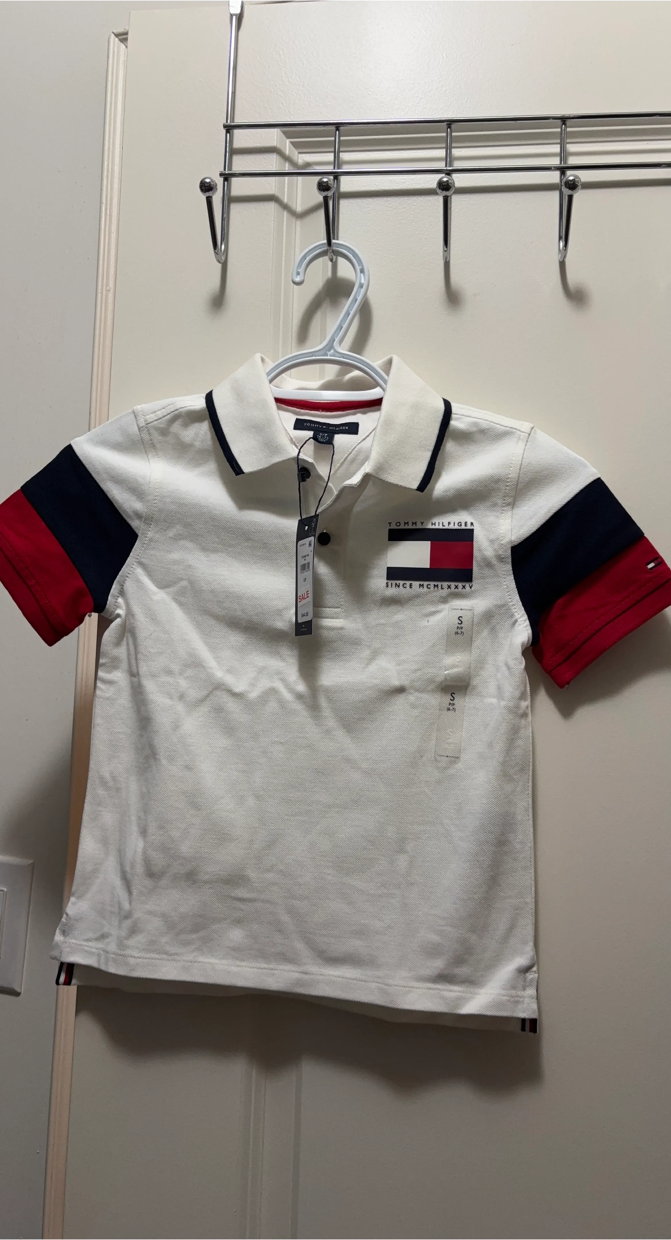 Here's a Tommy Hilfiger polo shirt in size S (6-7). It's white with red and navy accents on the sleeves and collar. Perfect for your little one!