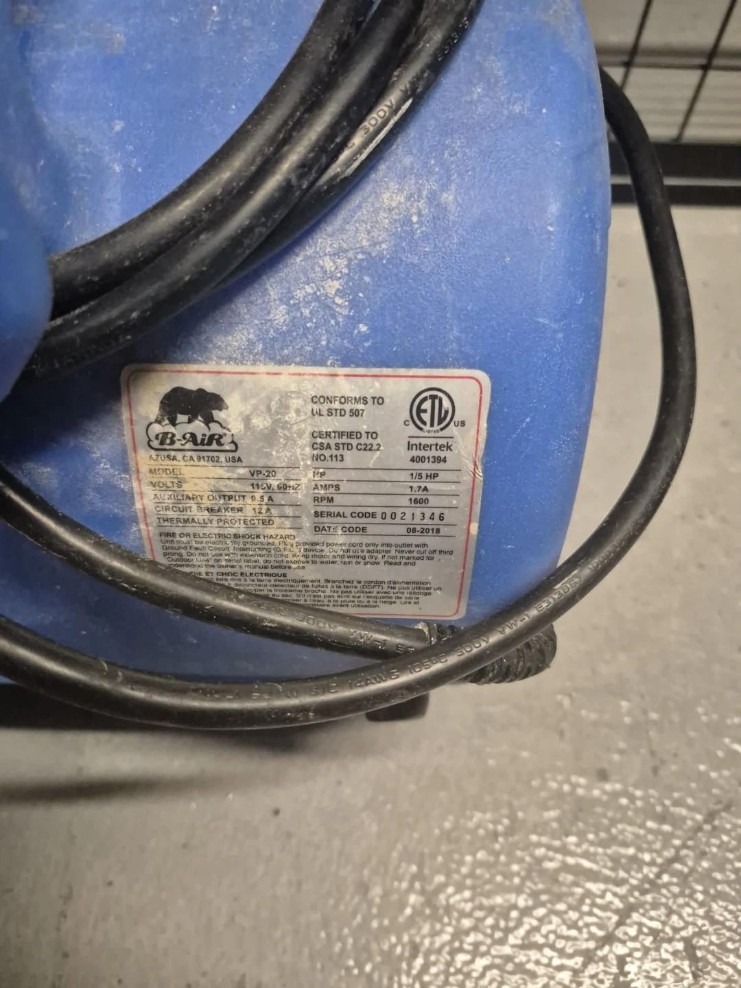 Selling a B-Air VP-20 air mover blower fan. It's blue and in good working condition.