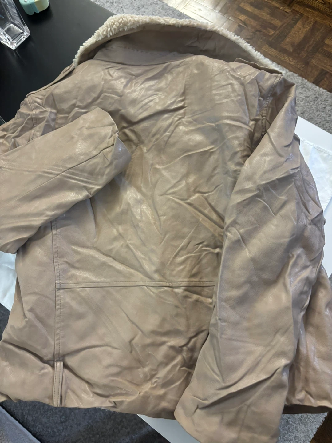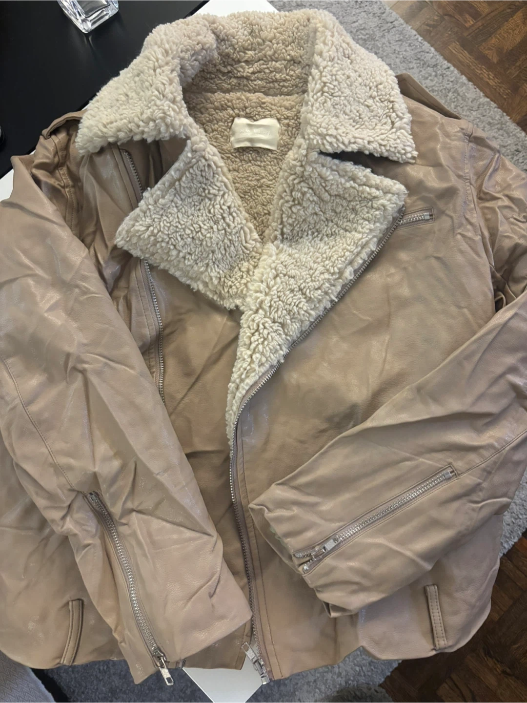 Buy & SellBeige Faux Leather Shearling JacketBeige Faux Leather Shearling Jacket$20Selling a beige faux leather jacket with a shearling collar and lining. Although it’s wrinkly, it’s in good condition.ConditionOkayTallaMBrandUnknownWHERE TO MEETIsabella YongeView MapSELLERverifiedqueenbeeChurch Yonge Corridor18312 reviews0 chats·0 favorites·11 viewsSEND CHAT TO SELLERHi queenbee! I’m interested in your listing.Hi queenbee! I’m interested in your listing.Get the Karrot app to chatSign In to chat
