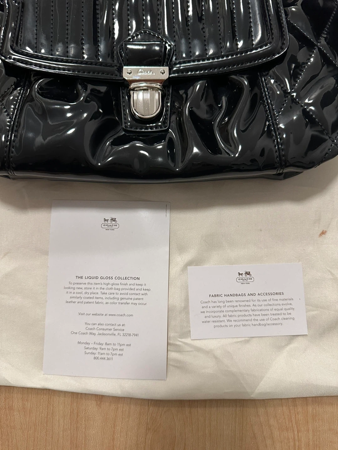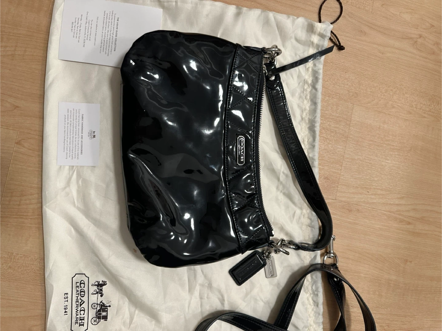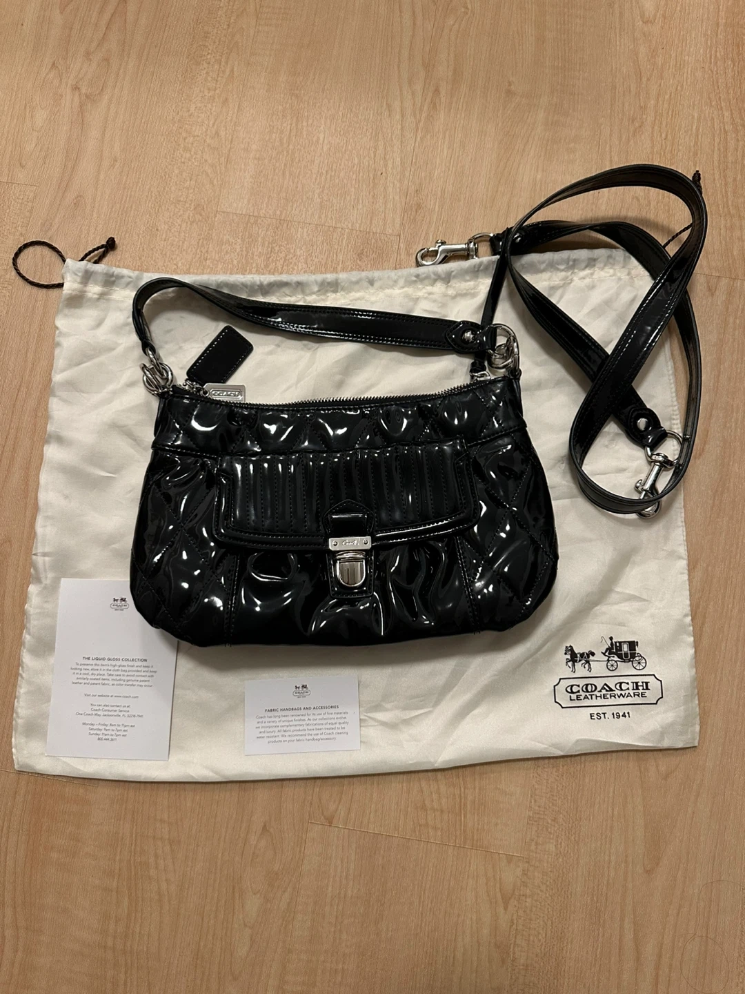 Selling a Coach crossbody bag in black patent leather. It has a quilted design and comes with its original dust bag. It's in great condition!