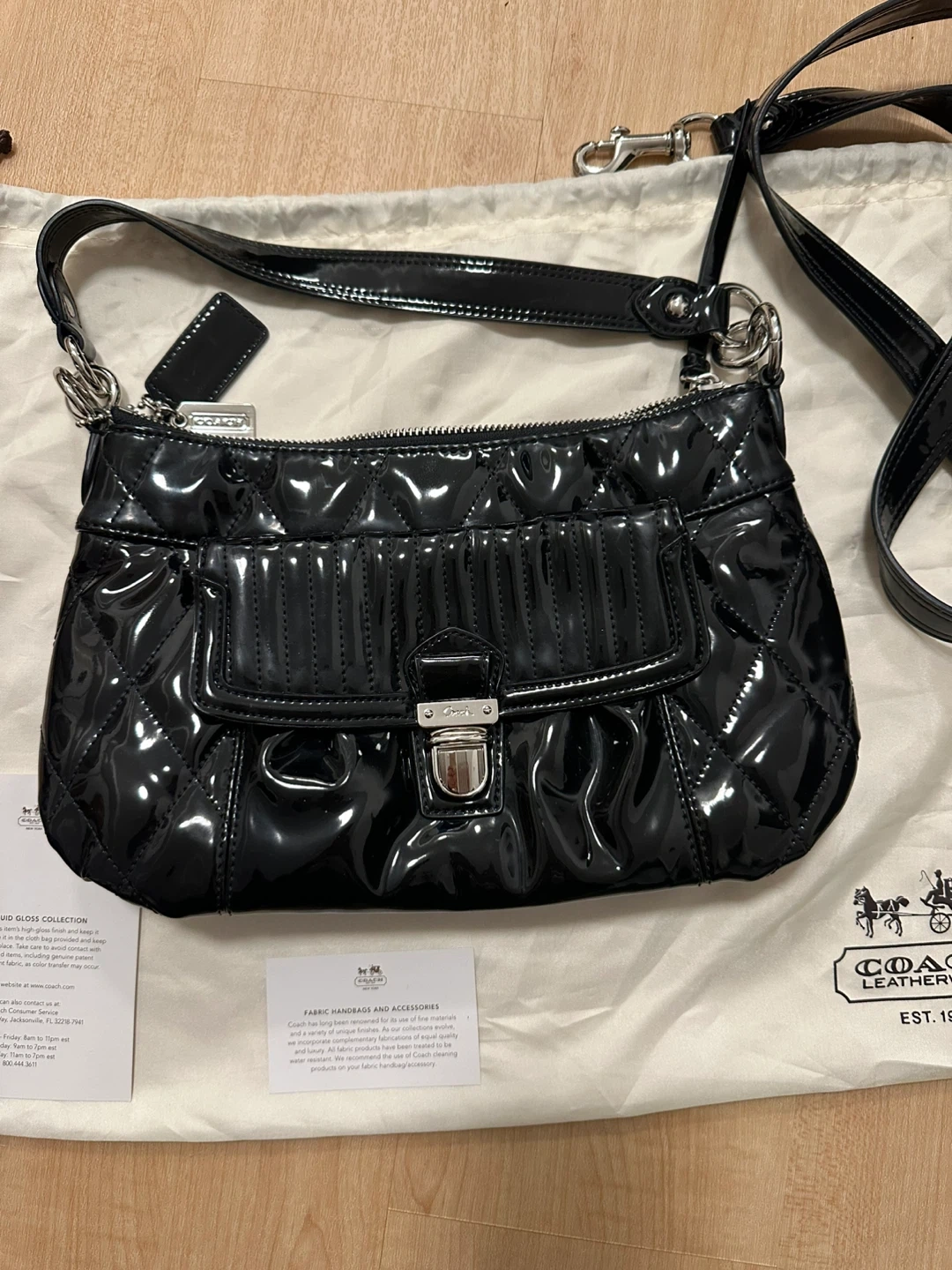 Selling a Coach crossbody bag in black patent leather. It has a quilted design and comes with its original dust bag. It's in great condition!