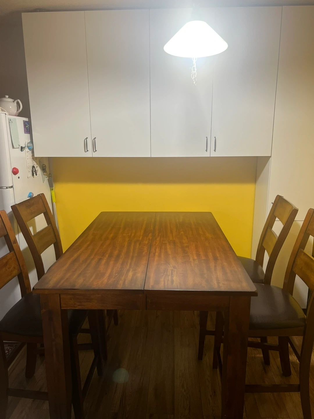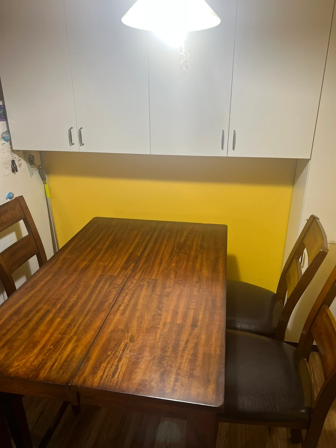 Selling a dining table with four chairs! The set is made of solid wood with a dark finish. It's perfect for a dining area or kitchen. The high chairs have black seats, which are easy to clean. It is in good condition and ready for a new home!