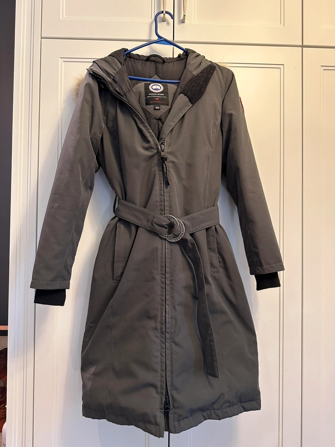 Selling a Canada Goose Whistler parka in size XS. It's in great condition and ready to keep you warm this winter! The jacket features a stylish belt with a unique buckle design. Perfect for those cold Canadian days!