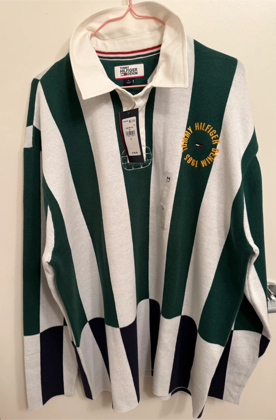 Tommy Hilfiger Denim rugby shirt in size M. It features a green and white striped design with a navy blue checkered pattern at the bottom. The original price was $139.99!