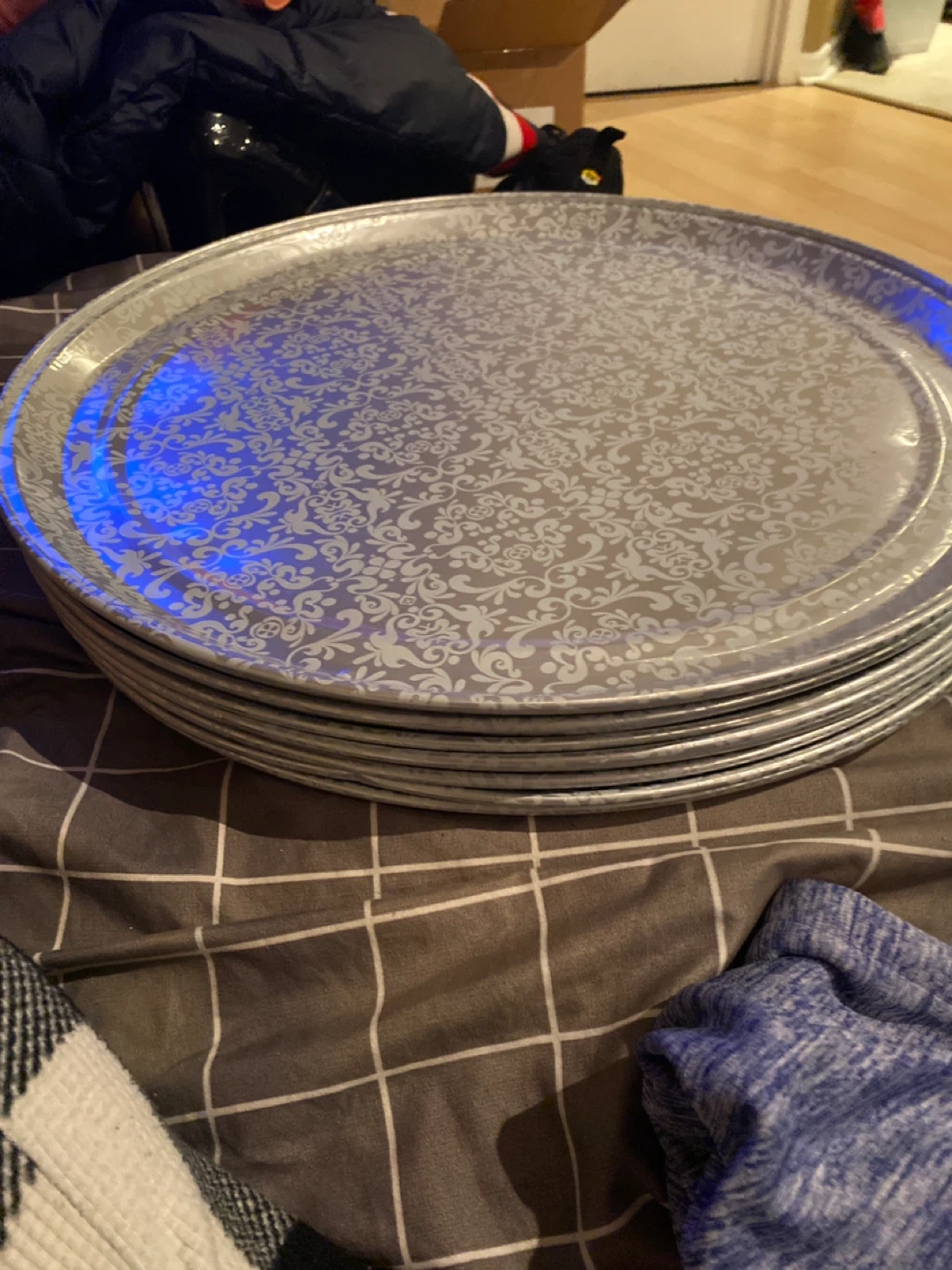 Selling a set of 10 pizza pans with a pretty silver pattern! They're in good condition and ready for your next pizza night. Perfect for baking or serving up your favourite homemade pizzas