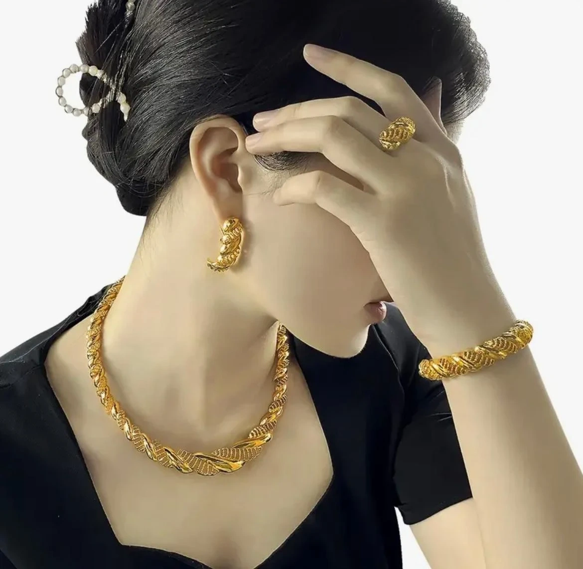 Selling a beautiful gold-toned jewellery set, including a necklace, bracelet, ring, and earrings! This set is perfect for adding a touch of elegance to any outfit
