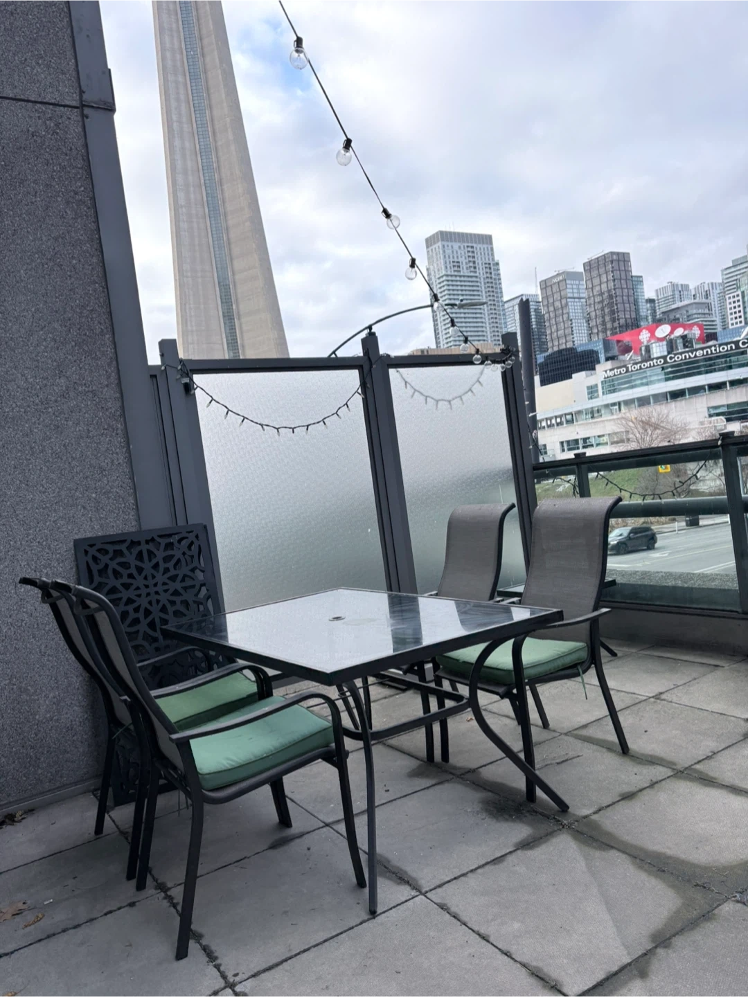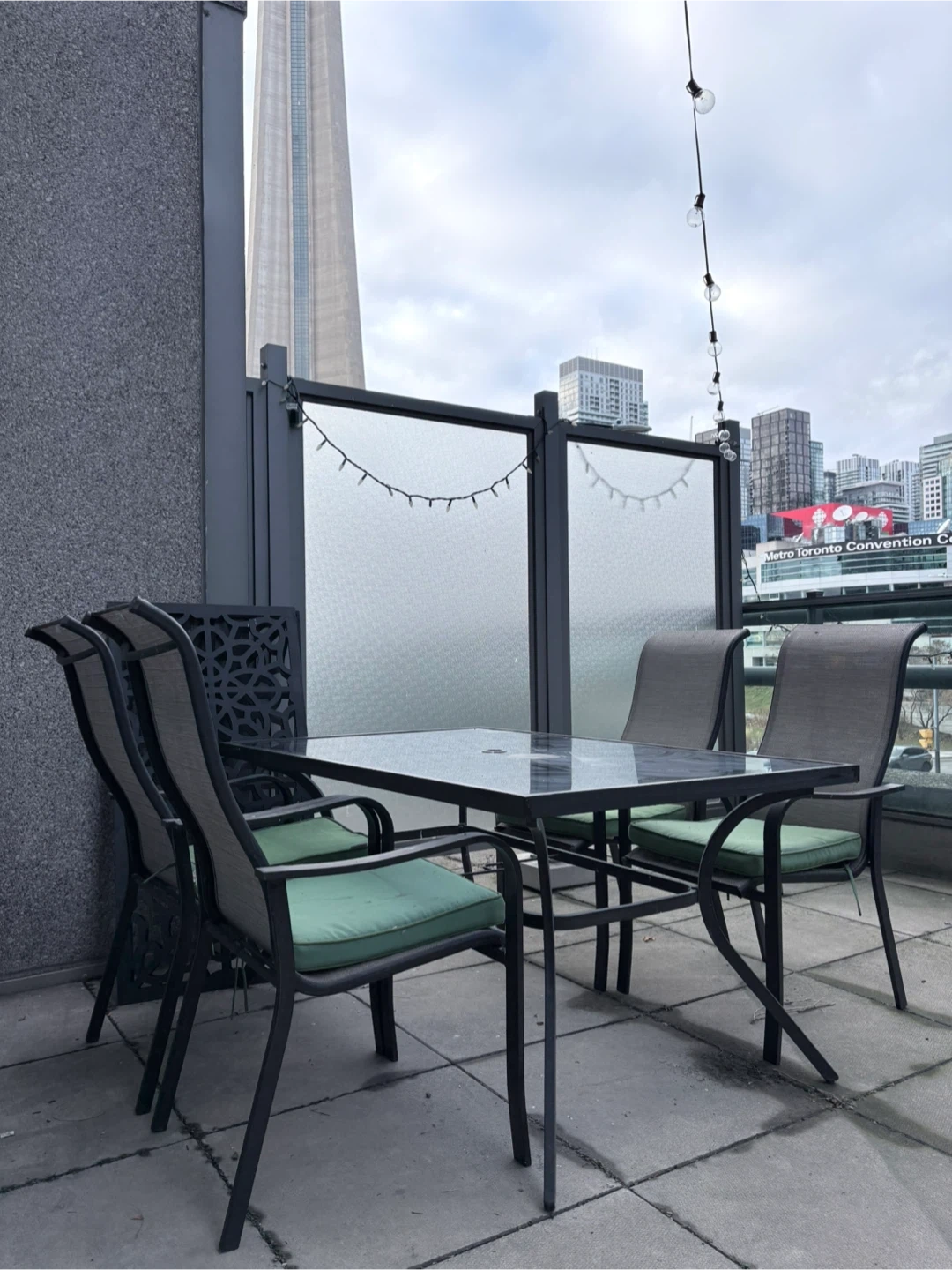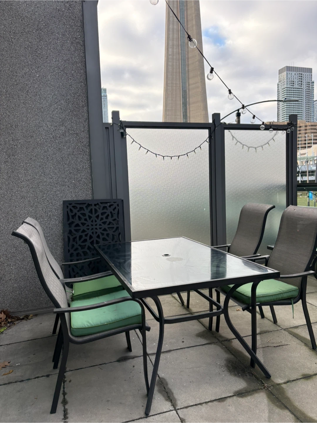 Selling a patio table with four chairs! The set has a glass table top and comfortable washable cushions. Perfect for enjoying the outdoors on your balcony or patio