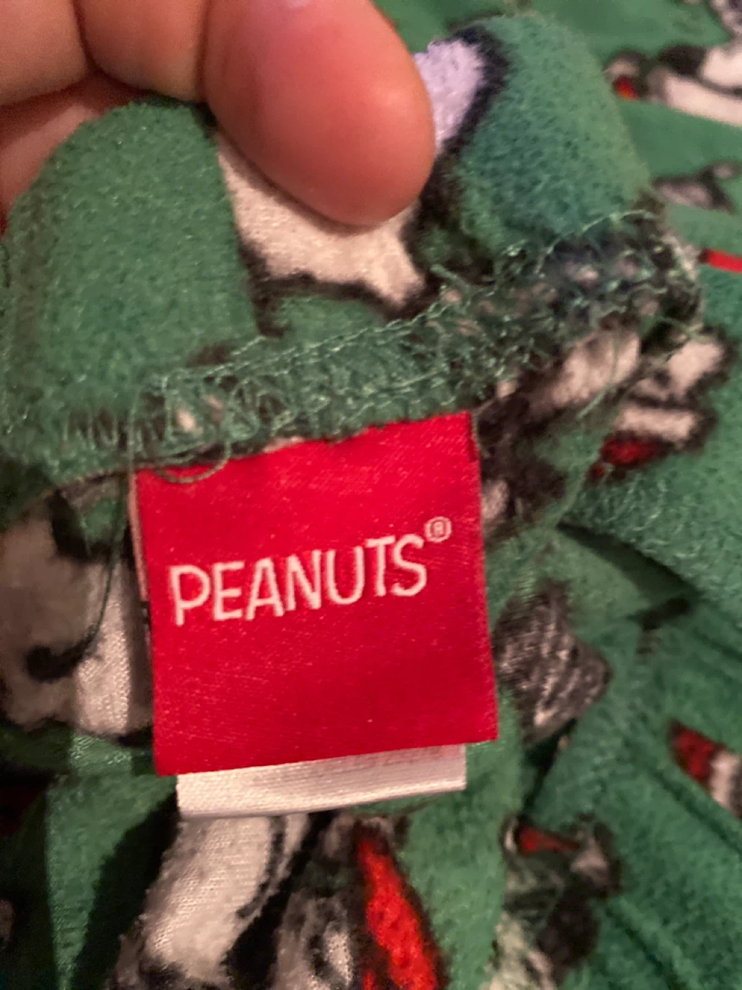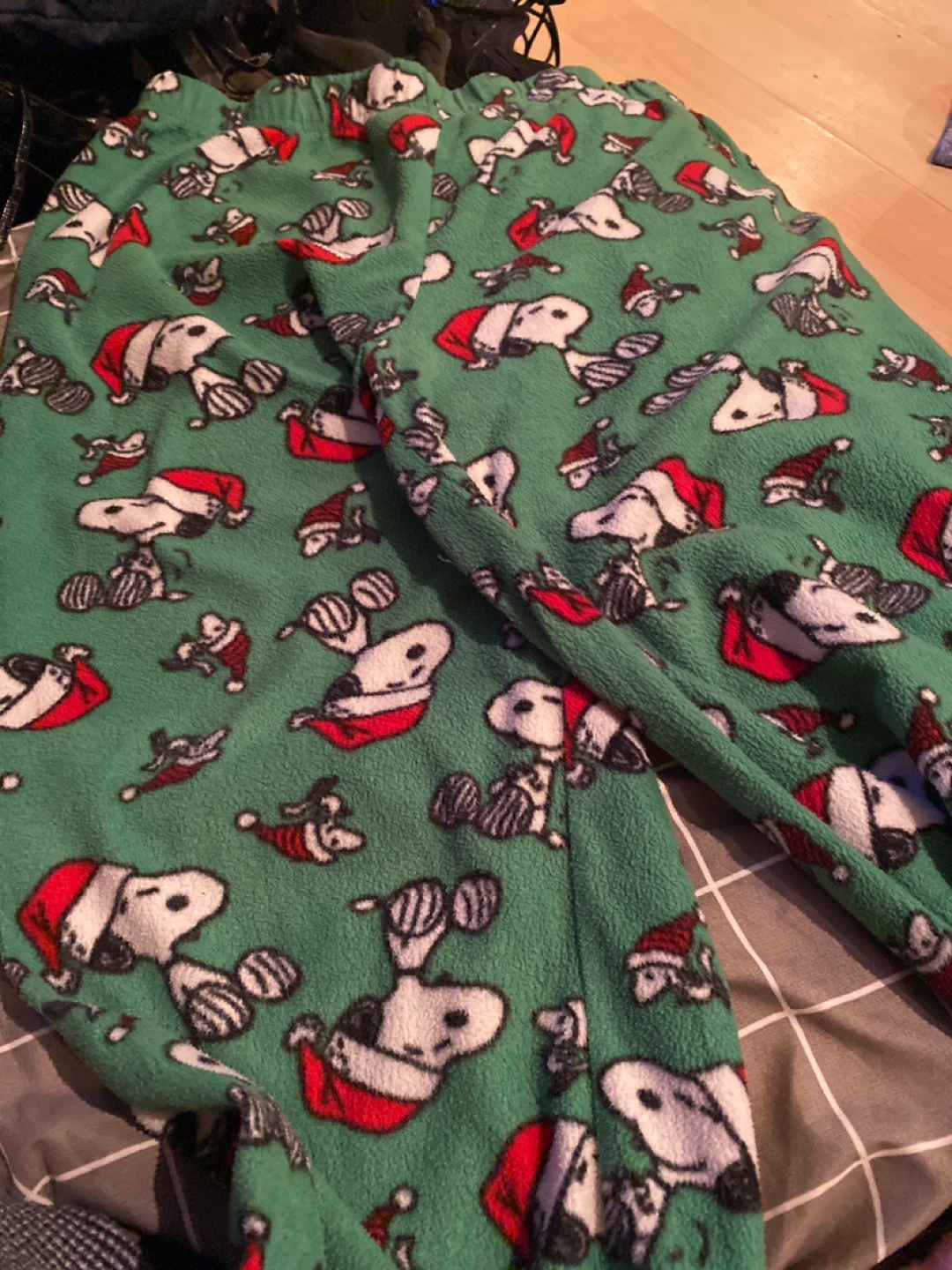 Cozy up with these fun Peanuts pajama pants! They feature an all-over print of Snoopy wearing a Santa hat on a green fleece material. Perfect for lounging around the house during the holidays or any time of year! Size large and fun to wear