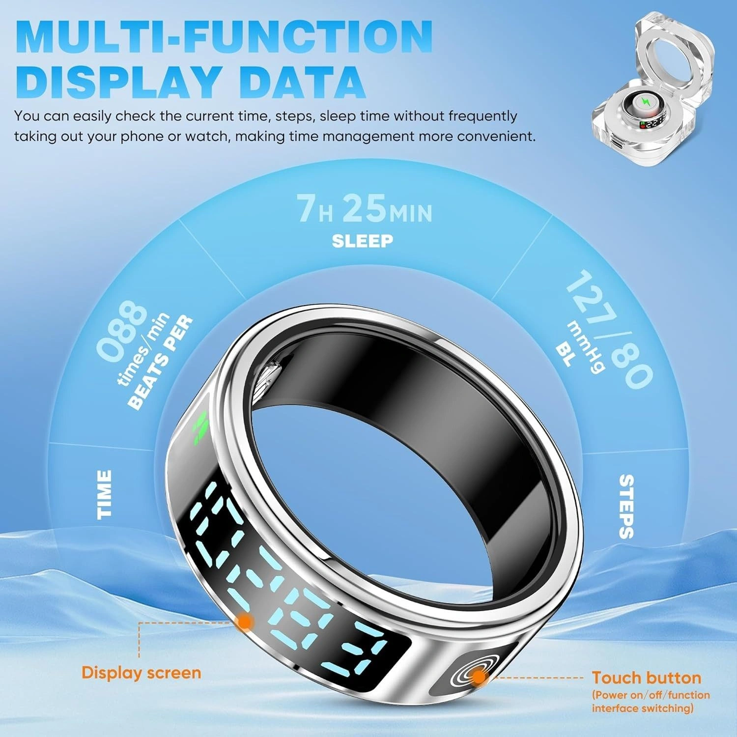 Smart Ring with Display, Health Tracker, Bluetooth, Size 12