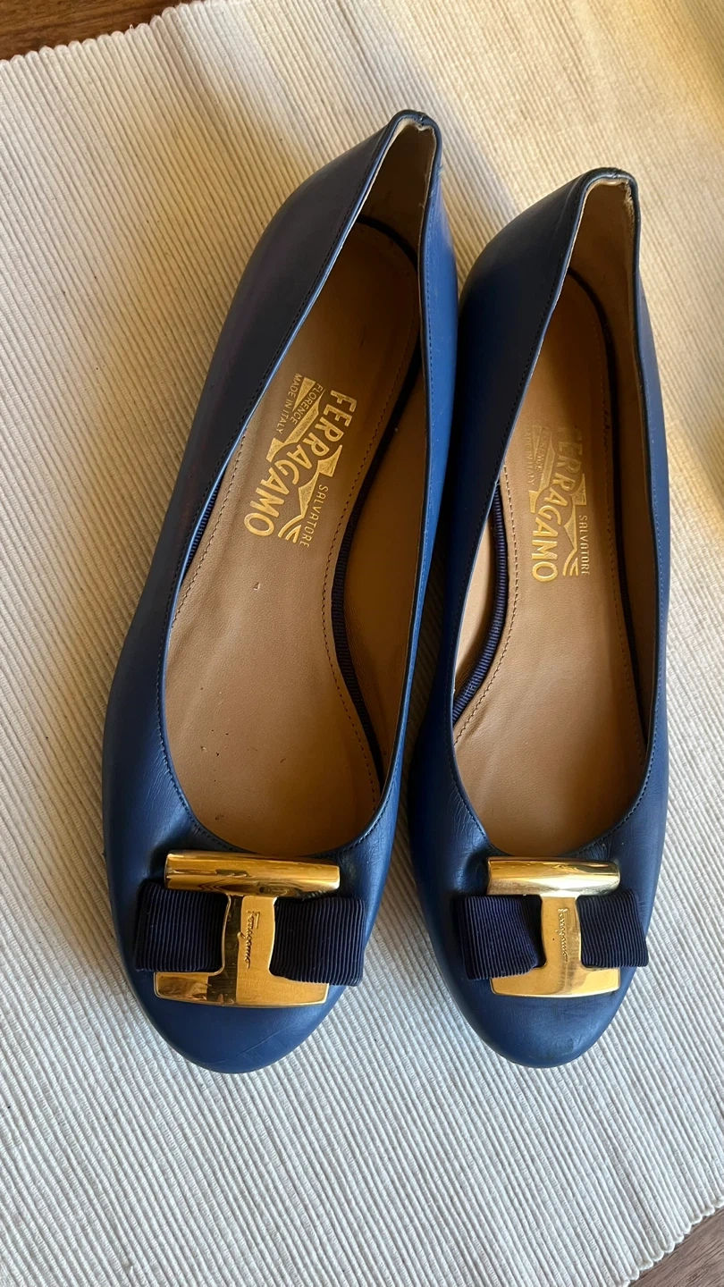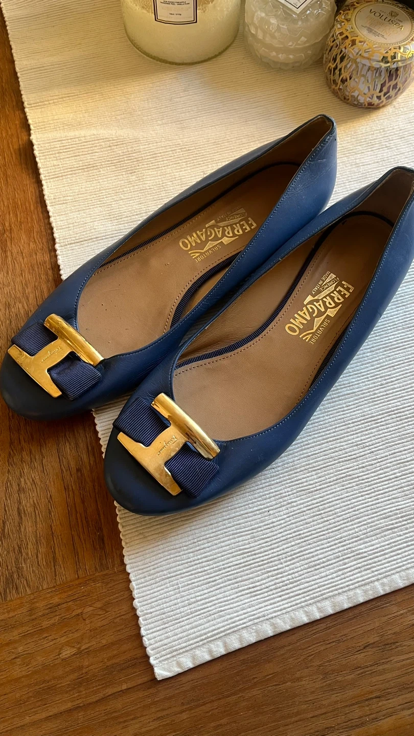These Salvatore Ferragamo leather ballerinas are in great condition! They feature a signature tonal grosgrain bow and a gold-tone metal logo plaque. A stylish and comfortable choice for any occasion!