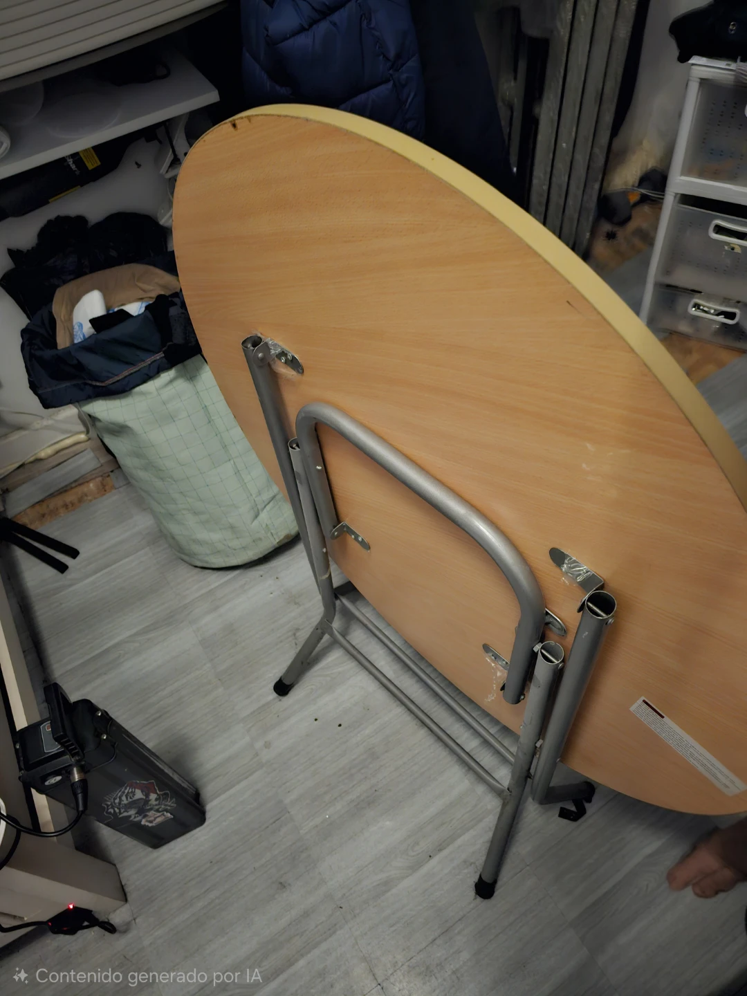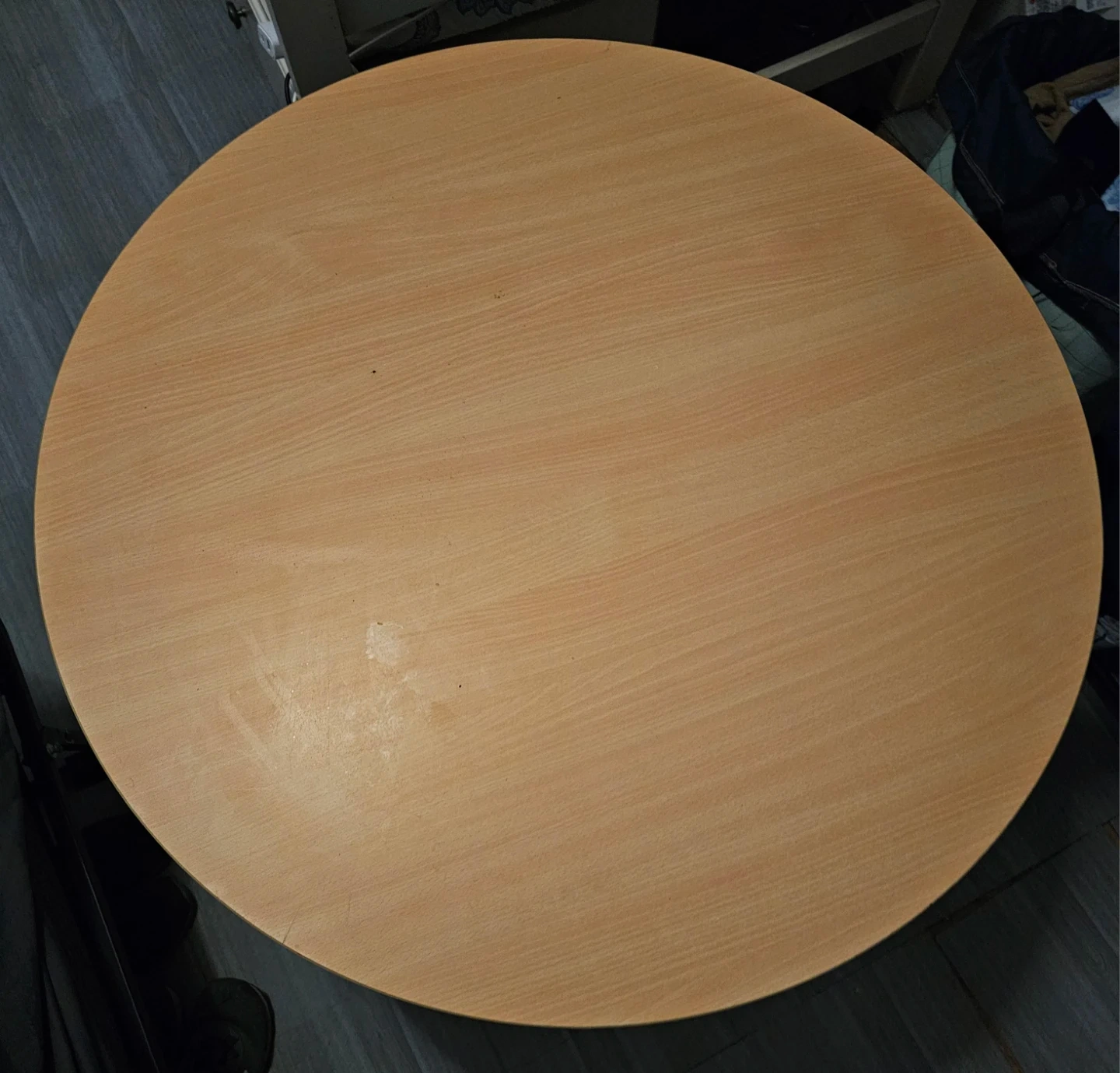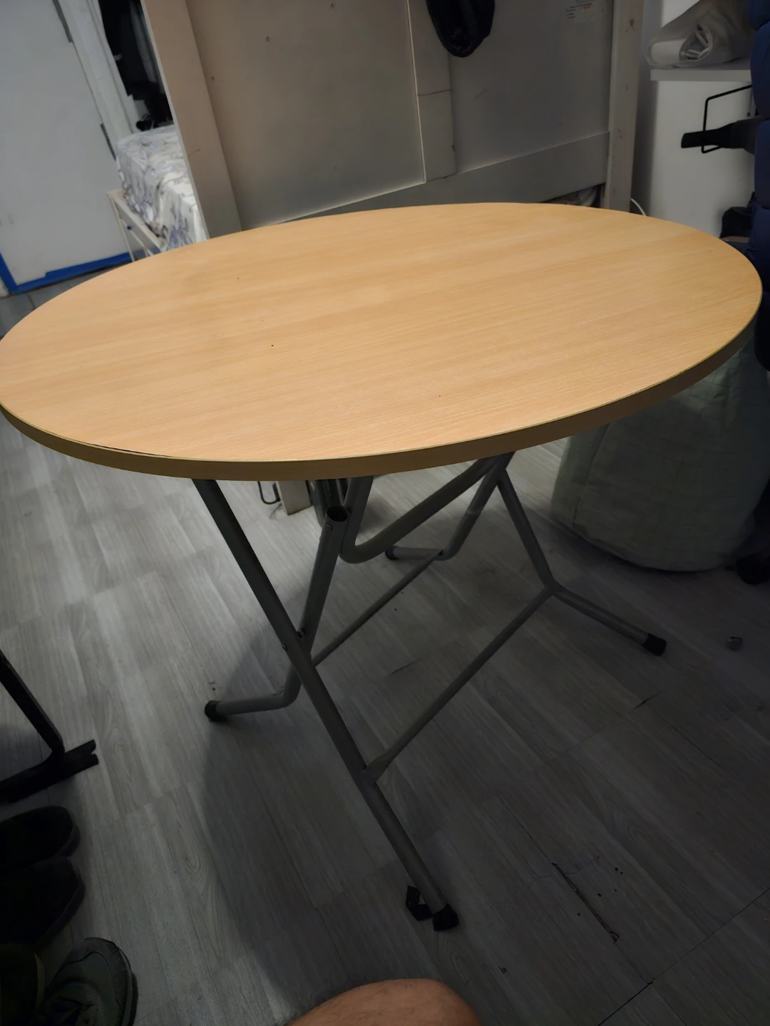 Selling a round folding table with a light wood finish. It's perfect for small spaces and easy to store when not in use. The table has a sturdy metal frame and a smooth tabletop.