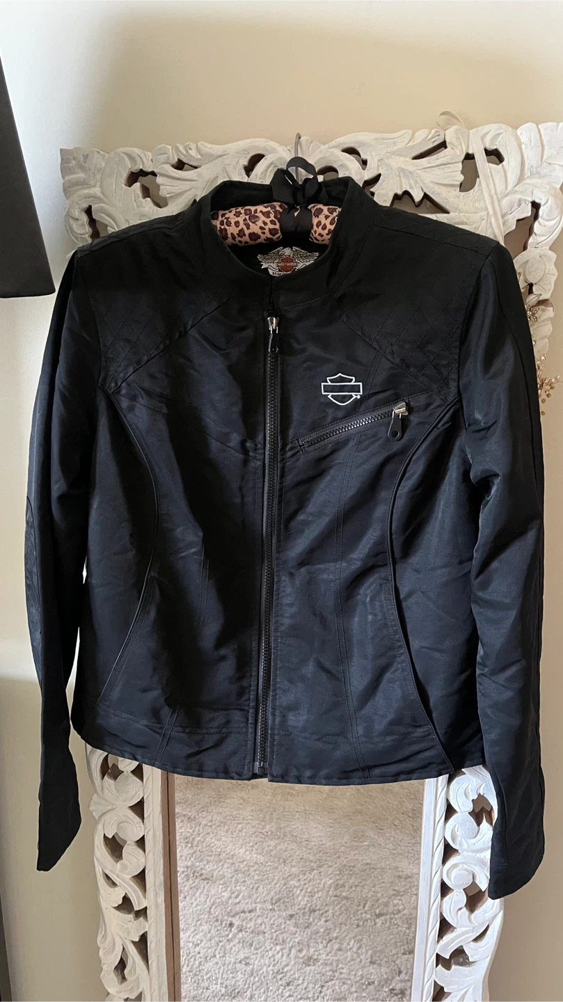 Harley-Davidson black jacket. It's made of 53% polyester and 47% nylon. The lining is 100% polyester. Perfect for any Harley enthusiast!
