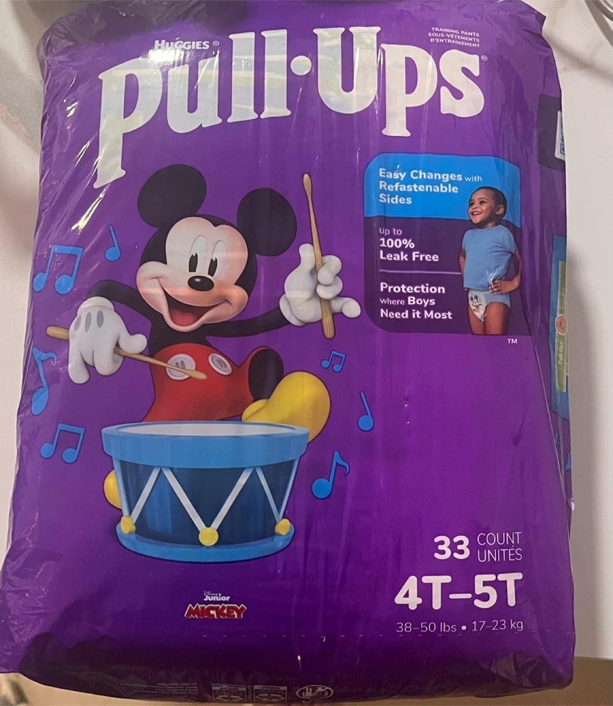 Selling a bag of Pull-Ups Boys' Potty Training Underwear. The size is 4T-5T. This bag contains 33 training pants. They feature easy changes with refastenable sides and up to 100% leak-free protection where boys need it most