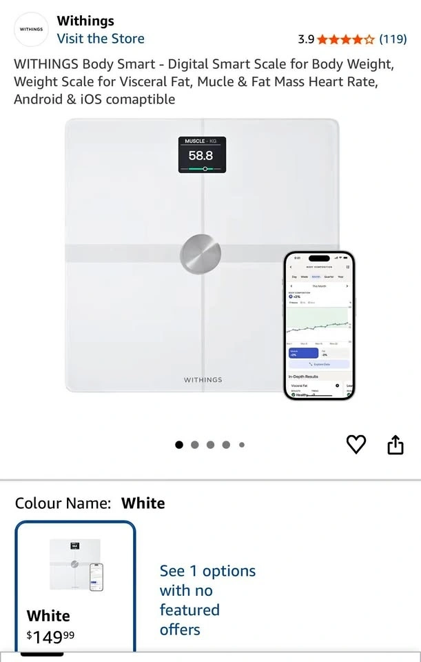 Buy & SellWITHINGS Body Smart - Digital Smart Scale for Body WeightWITHINGS Body Smart - Digital Smart Scale for Body Weight$38WITHINGS Body Smart - Digital Smart Scale for Body Weight, Weight Scale for Visceral Fat, Mucle & Fat Mass Heart Rate, Android & iOS comaptibleWHERE TO MEETCheck LocationView MapSELLERverifiedRajatNW Brampton23817 reviews1 chats·2 favorites·30 viewsSEND CHAT TO SELLERHi Rajat! I’m interested in your listing.Hi Rajat! I’m interested in your listing.Get the Karrot app to chatSign In to chat