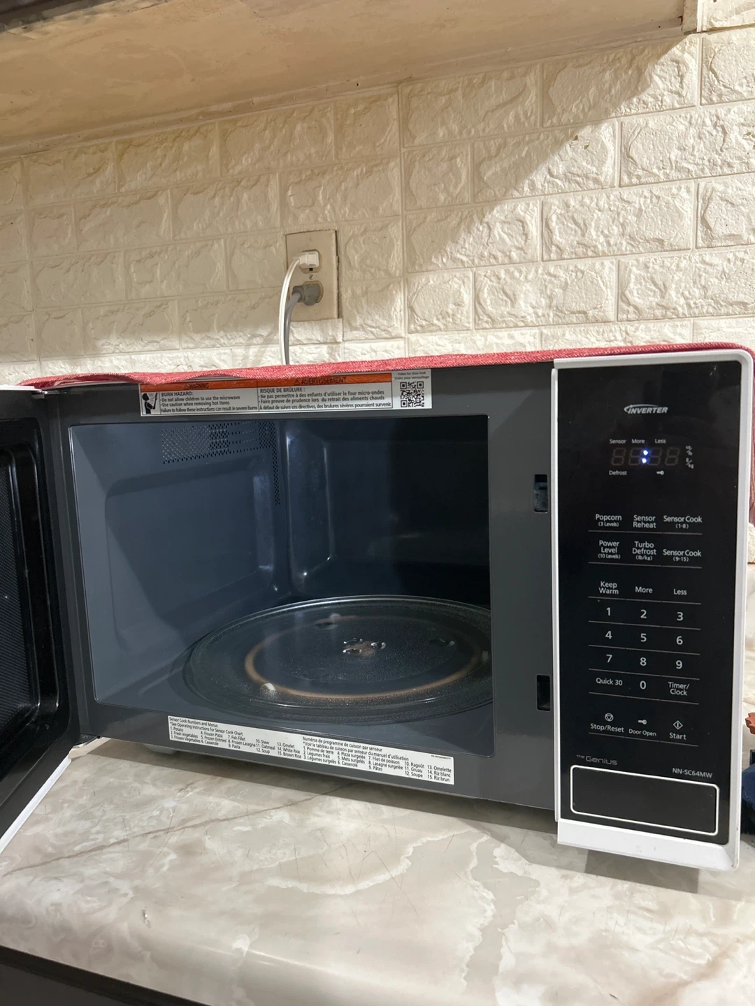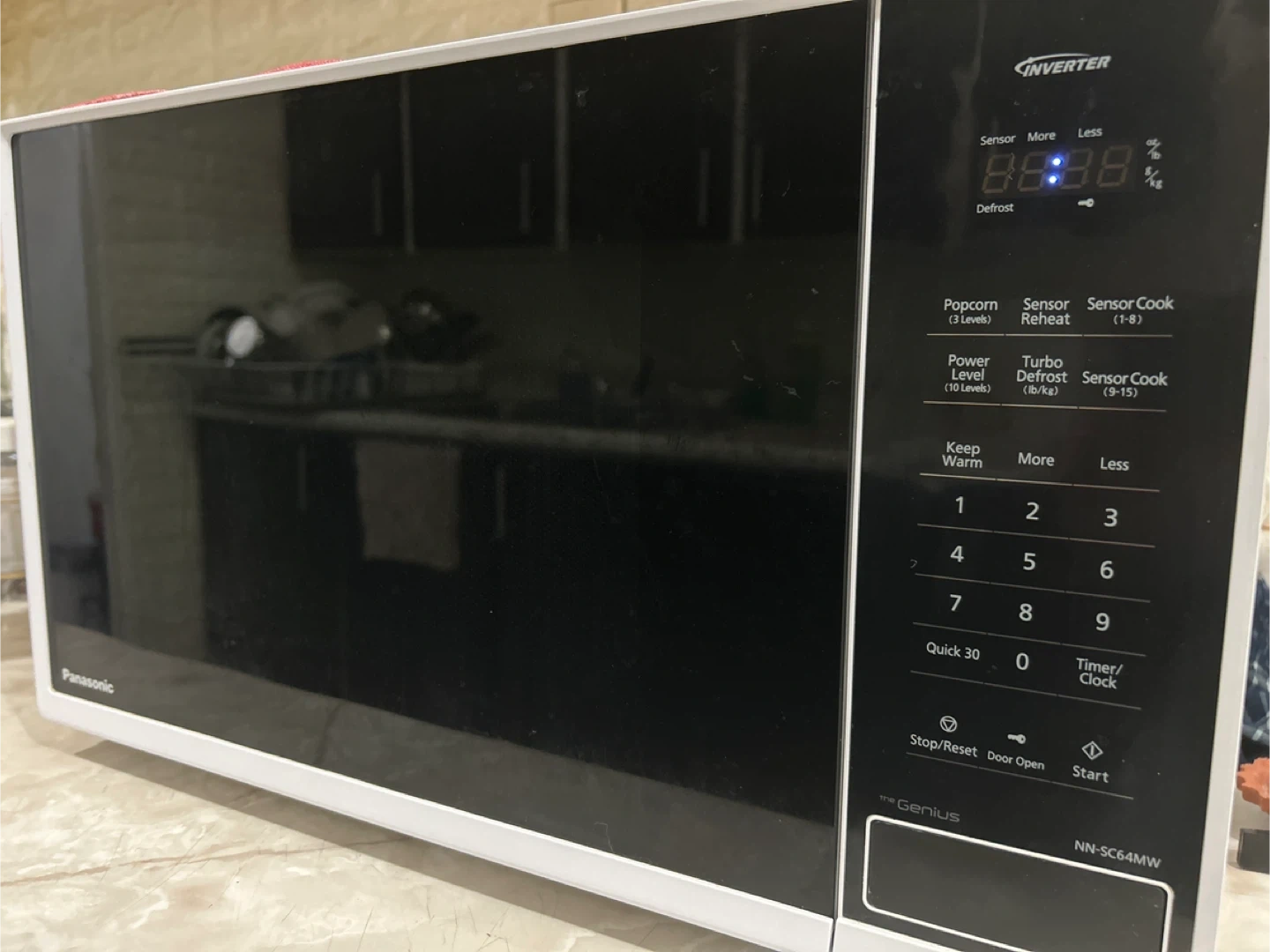 Selling a Panasonic Genius microwave oven, model NN-SC64MW. It's in great shape and ready to use! It features inverter technology for even cooking and has various sensor cook settings for popcorn, reheating, and cooking different foods. It also has a turbo defrost option and a quick 30-second button for convenience