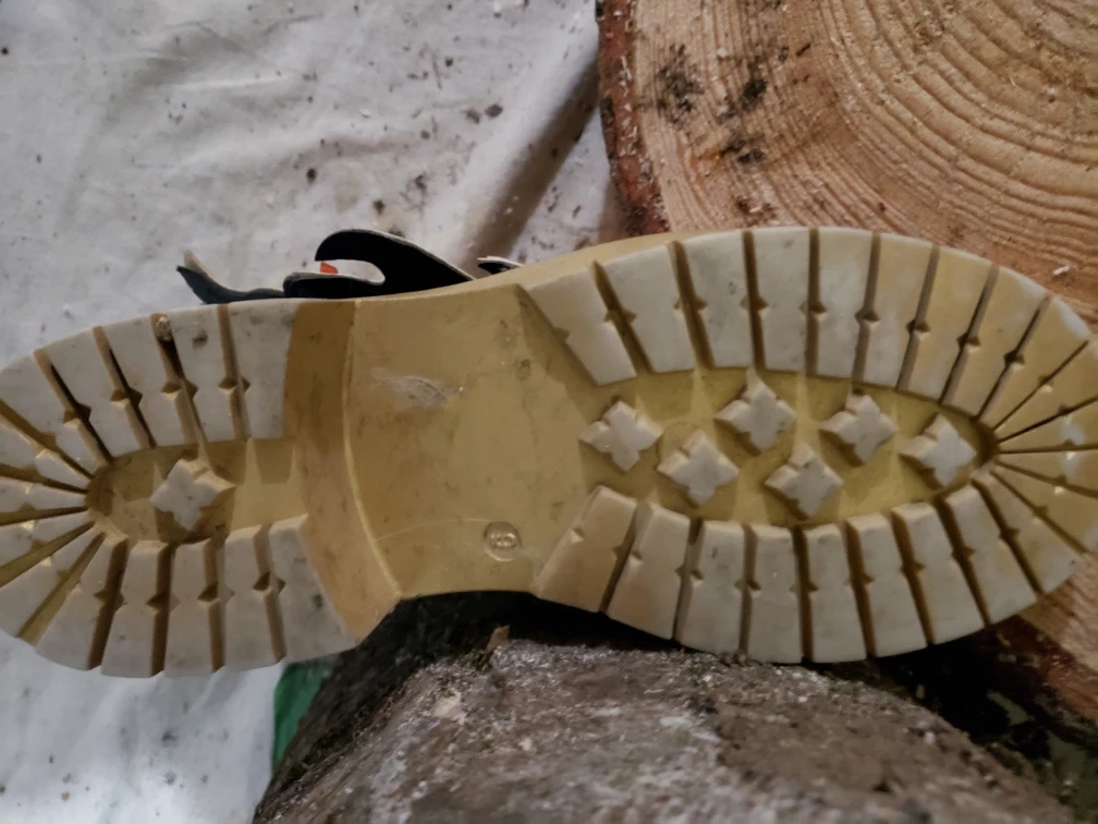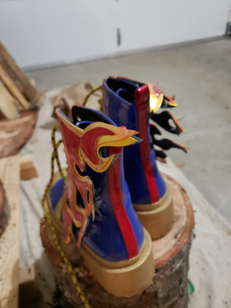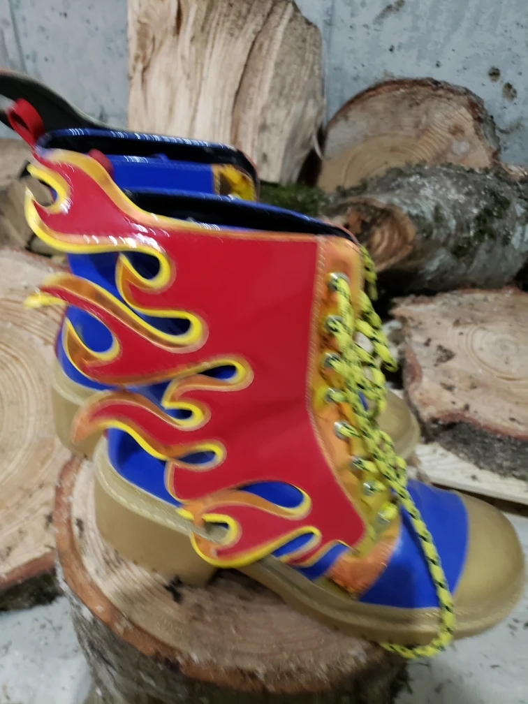 These are some really unique boots with a flame design! great for outdoor dance party. They're a size 9 and have a cool colour scheme with red, blue, and gold accents. They've got a lug sole too!