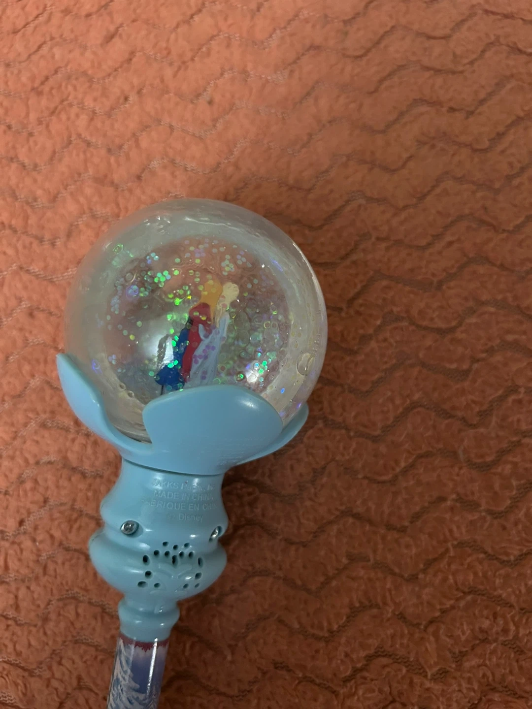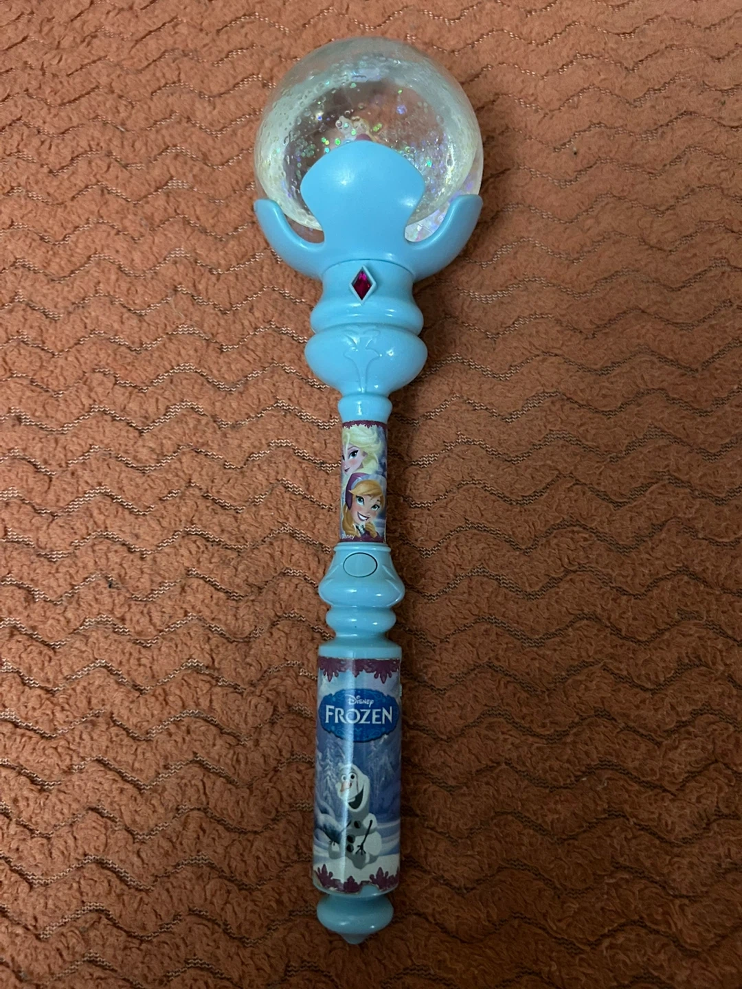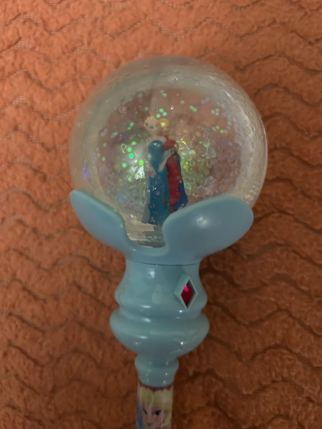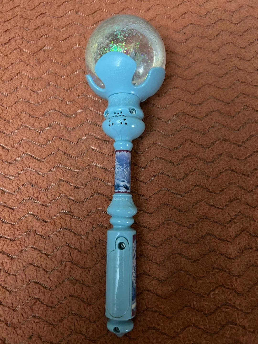 Add a touch of Frozen magic with this Disney Frozen wand, featuring Elsa and Anna in a glitter globe! This used wand is in good condition and ready to spark imaginative play.