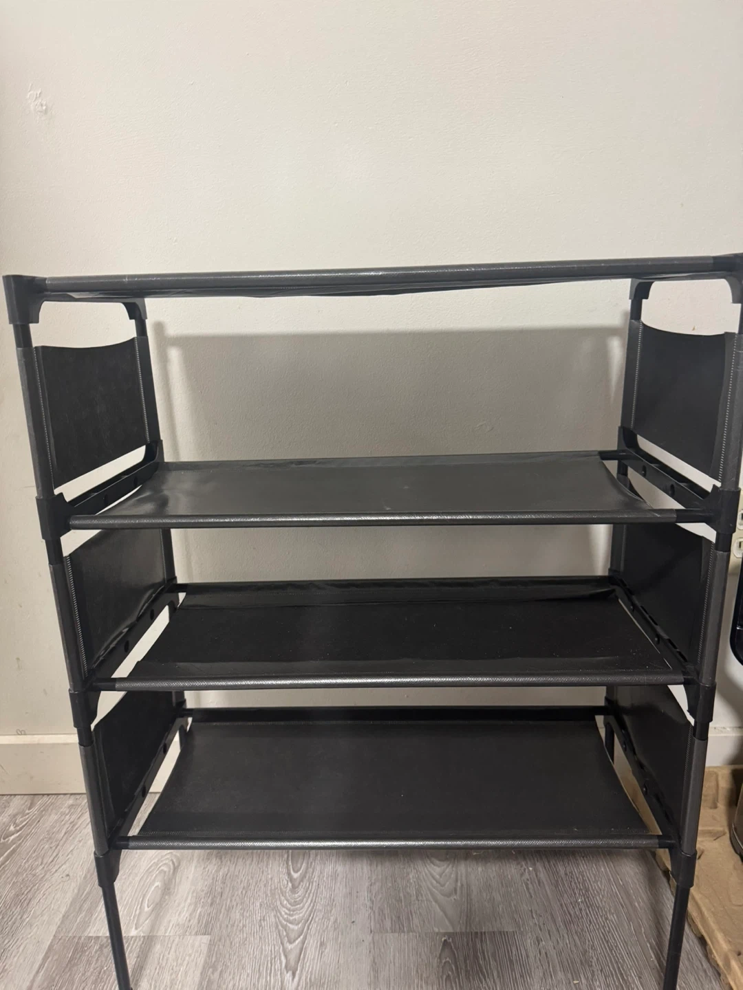 Selling a handy black 4-tier shoe rack! It's in great shape and ready to help organize your footwear collection. Perfect for keeping your entryway tidy or adding extra storage to your closet