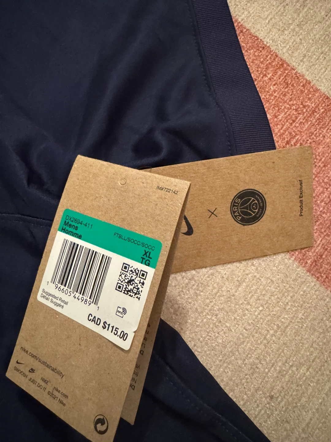 I'm selling a brand new Nike Paris Saint-Germain jersey in size XL! It's a men's home jersey, perfect for any fan. The suggested retail price on the tag is CAD $115.00