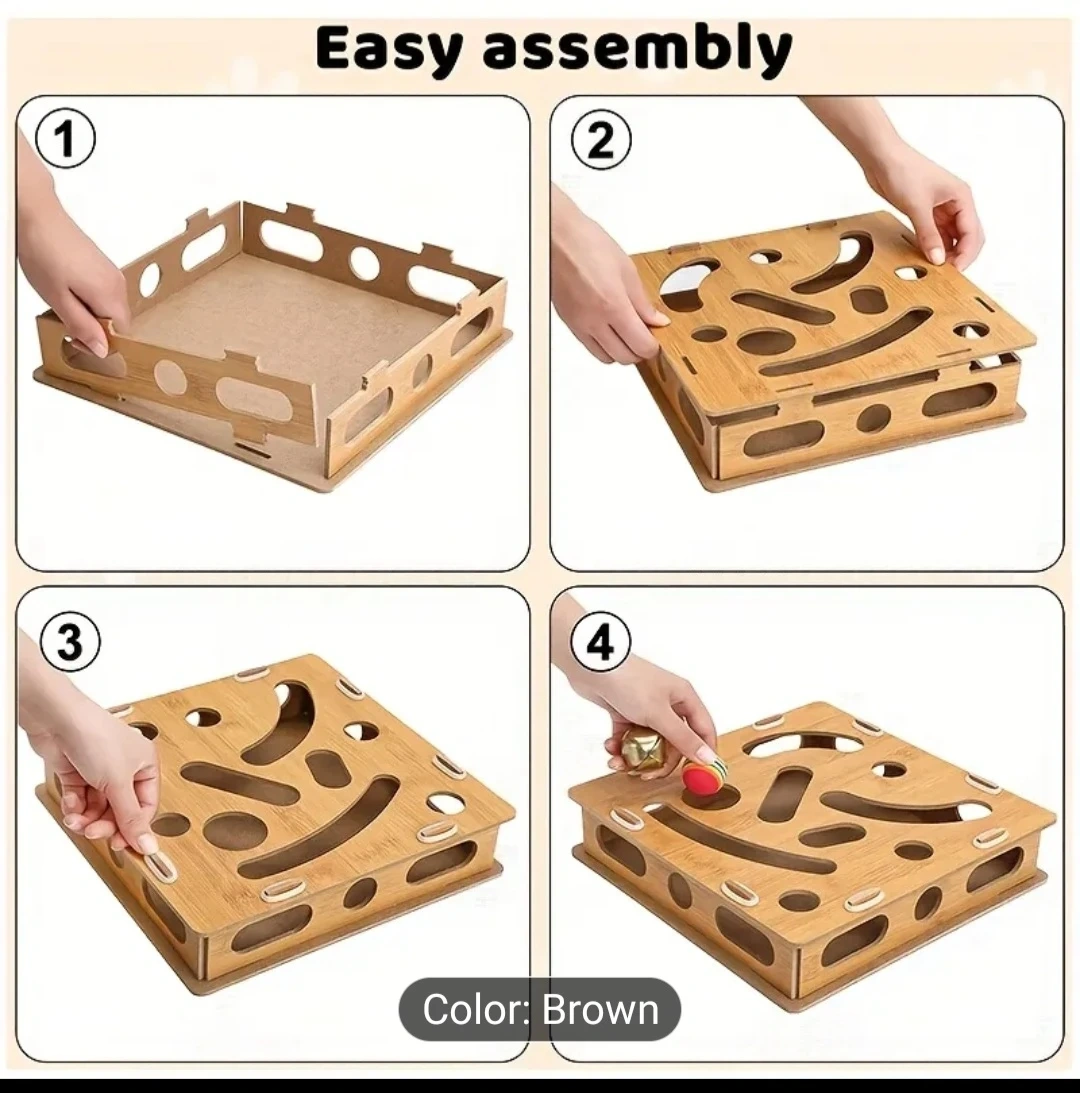 Keep your kitty entertained with this interactive wooden cat toy! It features 21 holes and 2 balls to simulate your cat's natural hunting instincts. It's designed to help get rid of boredom, anxiety, and loneliness. This toy is easy to assemble and is made of wood. The toy is brown and measures 11 inches by 11 inches.
