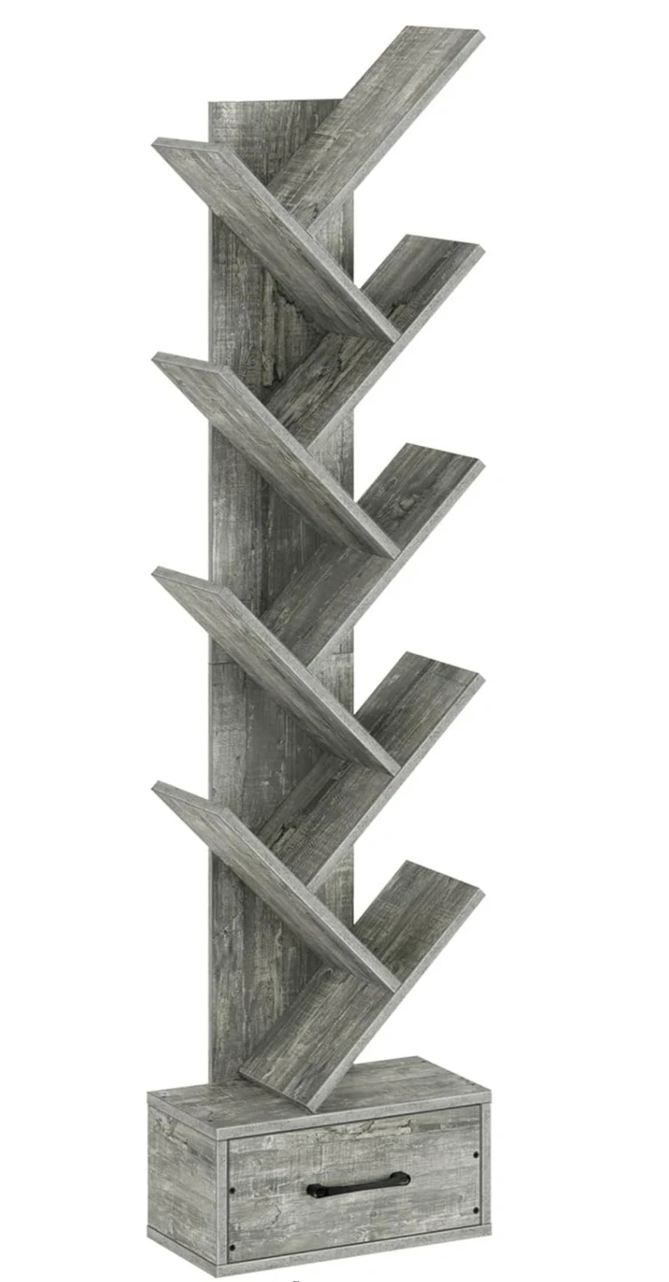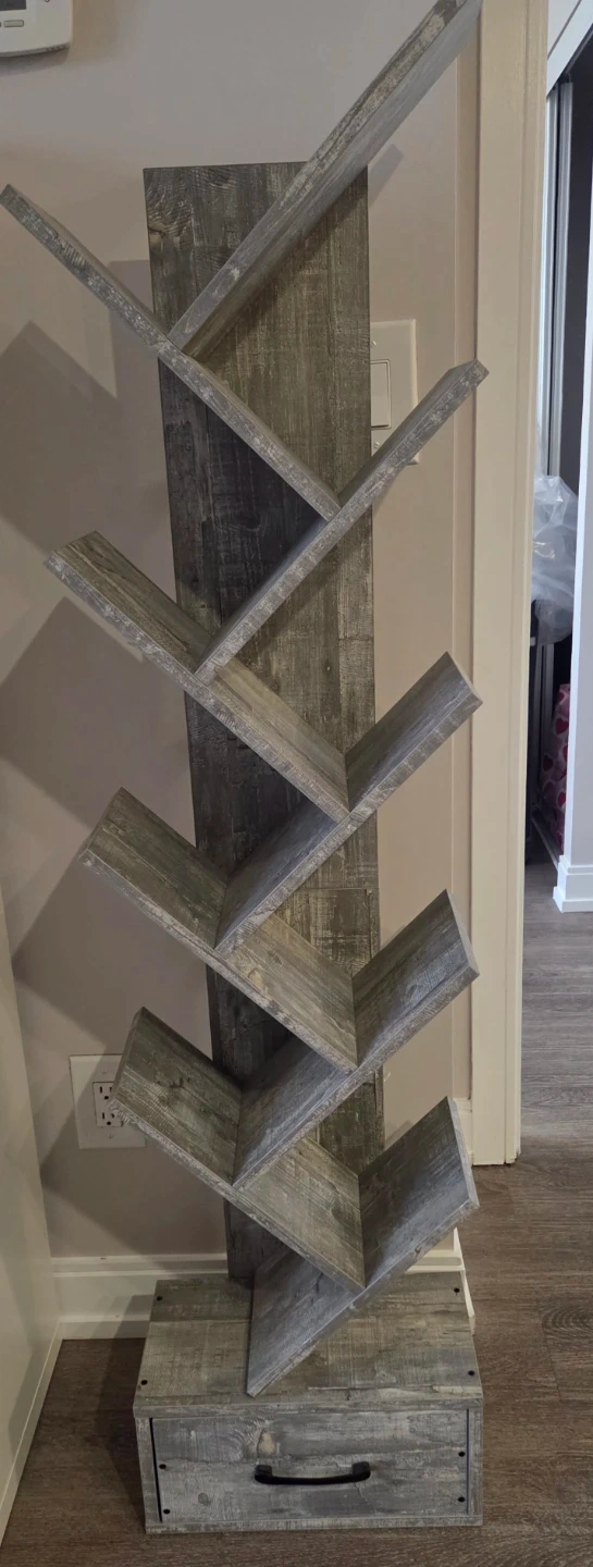 Selling a grey tree bookshelf. It has a unique design and includes a drawer at the bottom for extra storage. The dimensions are in the 3rd photo.Final sale,no returns or exchanges
