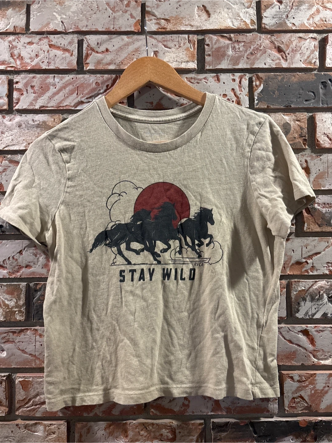 cute RVCA t-shirt with a 'Stay Wild' graphic! It features horses running, and the material is a soft beige colour. Perfect for a casual, relaxed look! Never used